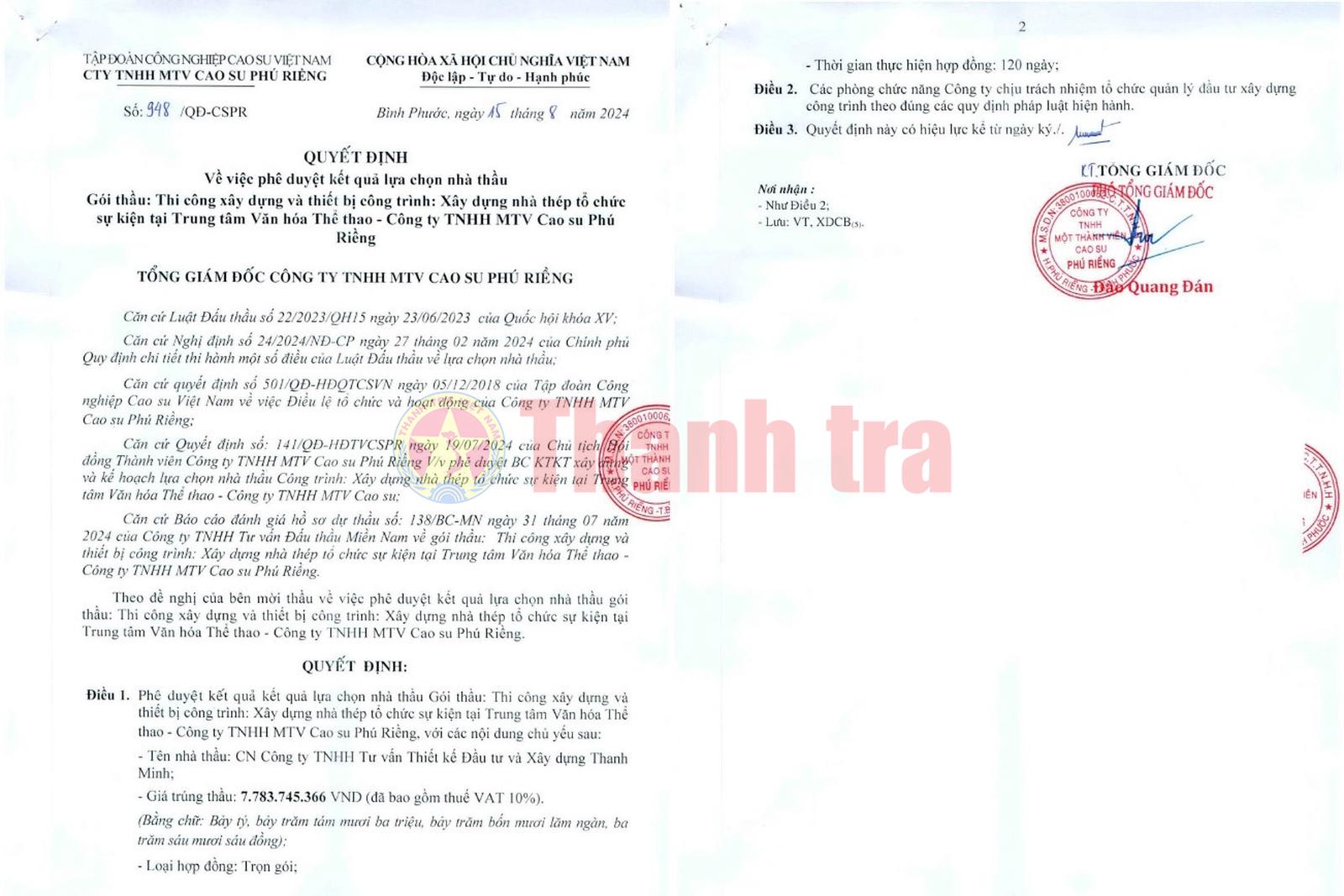 Một gói thầu thi công xây dựng do Công ty TNHH MTV Cao su Phú Riềng làm chủ đầu tư trong năm 2024, giá trúng thầu là hơn 7,783 tỷ đồng chênh lệch ít hơn so với giá gói thầu chỉ "vỏn vẹn" khoảng 18 triệu đồng. Ảnh: Chu Tuấn