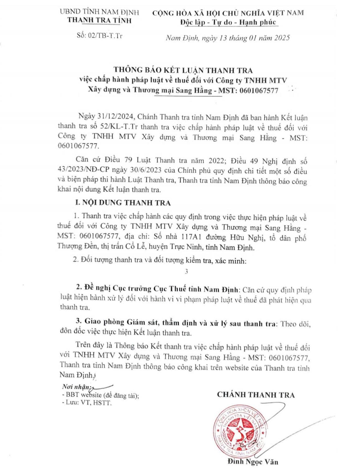 Theo đó, căn cứ vào báo cáo của đoàn thanh tra, ngày 31/12/2024, ông Đinh Ngọc Văn, Chánh Thanh tra tỉnh Nam Định đã ký ban hành Kết luận thanh tra số 52/KL-T.Tr thanh tra việc chấp hành pháp luật về thuế đối với Công ty TNHH MTV Xây dựng và Thương mại Sang Hằng (có địa chỉ tại số nhà 117A1 đường Hữu Nghị, tổ dân phố Thượng Đền, thị trấn Cổ Lễ, huyện Trực Ninh, tỉnh Nam Định) niên độ năm 2022 và năm 2023.