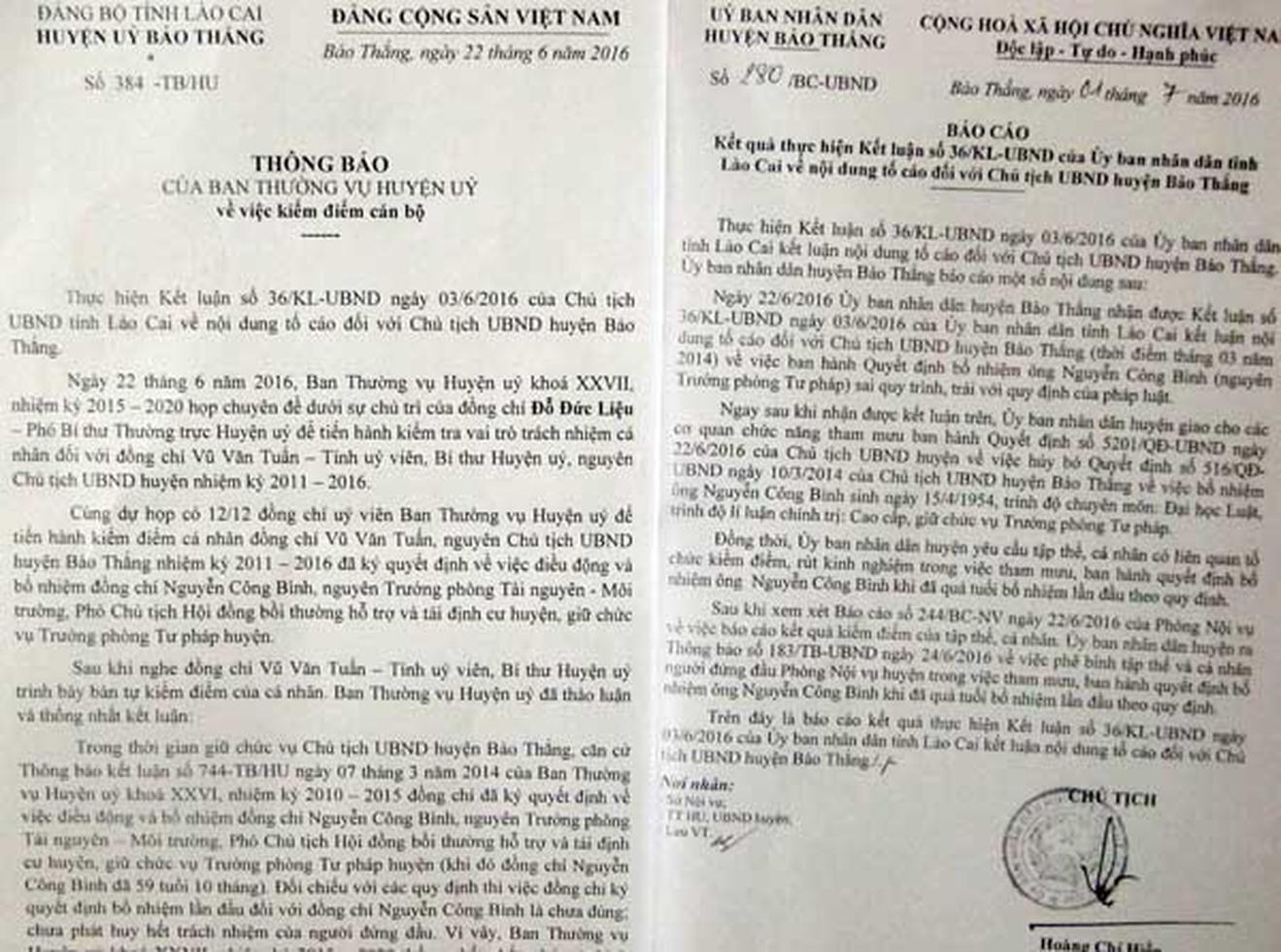 Ngày 3/6/2016, UBND tỉnh Lào Cai ban hành Kết luận số 36/KL-UBND về nội dung tố cáo đối với Chủ tịch UBND huyện Bảo Thắng. Kết luận nêu rõ việc công dân tố cáo Chủ tịch UBND huyện Bảo Thắng (thời điểm tháng 3/2014) ban hành quyết định điều động và bổ nhiệm ông Nguyễn Công Bình (nguyên Trưởng phòng Tư pháp huyện Bảo Thắng) khi đã quá tuổi bổ nhiệm lần đầu là đúng; Quyết định số 561/QĐ-UBND về việc điều động và bổ nhiệm cán bộ, bổ nhiệm ông Nguyễn Công Bình giữ chức vụ Trưởng phòng Tư pháp huyện là sai.