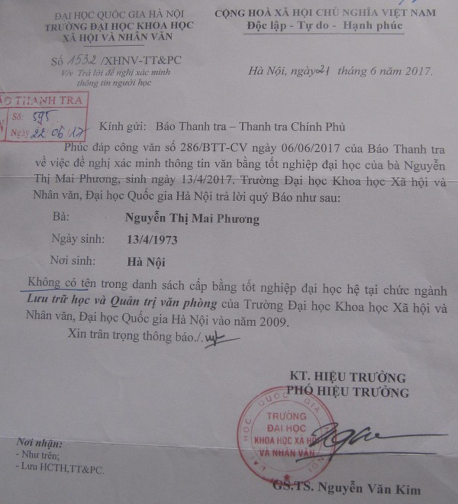 Ngày 21/6/2017, Trường Đại học KHXH&NV đã có Văn bản số 1532 nêu rõ: Bà Nguyễn Thị Mai Phương, sinh ngày 13/4/1973, nơi sinh, Hà Nội, không có tên trong danh sách cấp bằng tốt nghiệp đại học hệ tại chức ngành Lưu trữ học và Quản trị văn phòng của trường vào năm 2009.