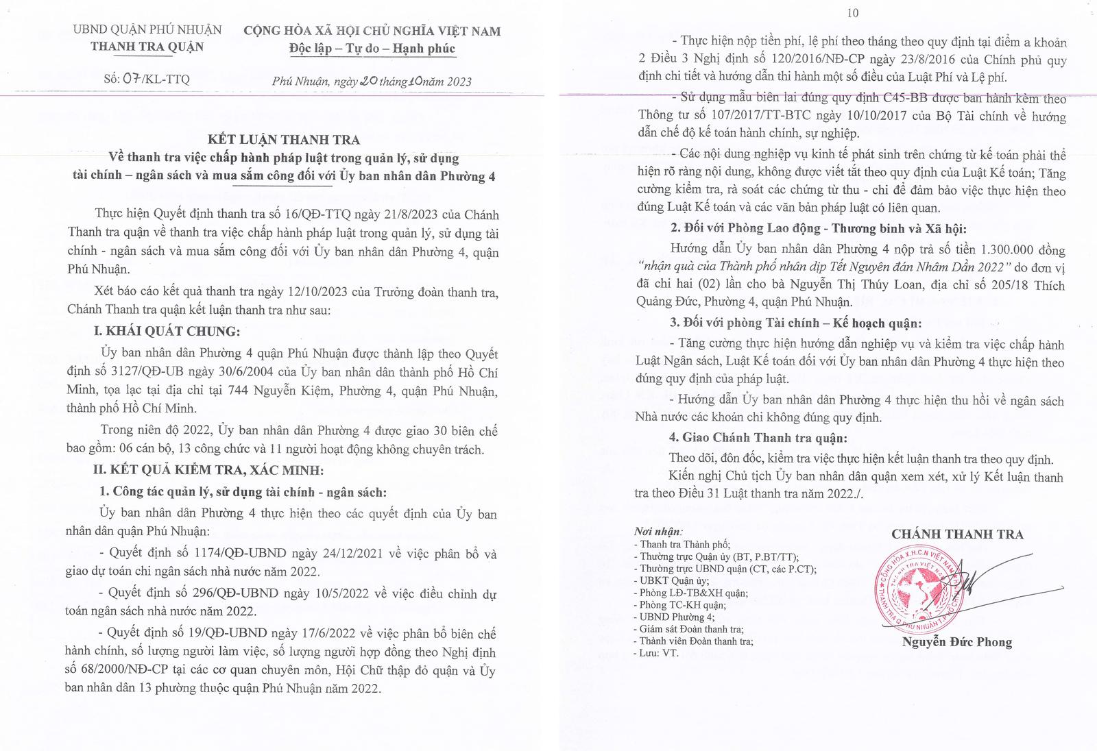 Từ những kết luận nêu trên, Chánh Thanh tra quận Phú Nhuận kiến nghị UBND phường 4 tổ chức họp kiểm điểm rút kinh nghiệm đối với Chủ tịch, Phó Chủ tịch phụ trách văn hóa - xã hội, Chỉ huy trưởng Ban Chỉ huy Quân sự, kế toán, thủ quỹ và công chức có liên quan, nhanh chóng khắc phục các hạn chế, thiếu sót.