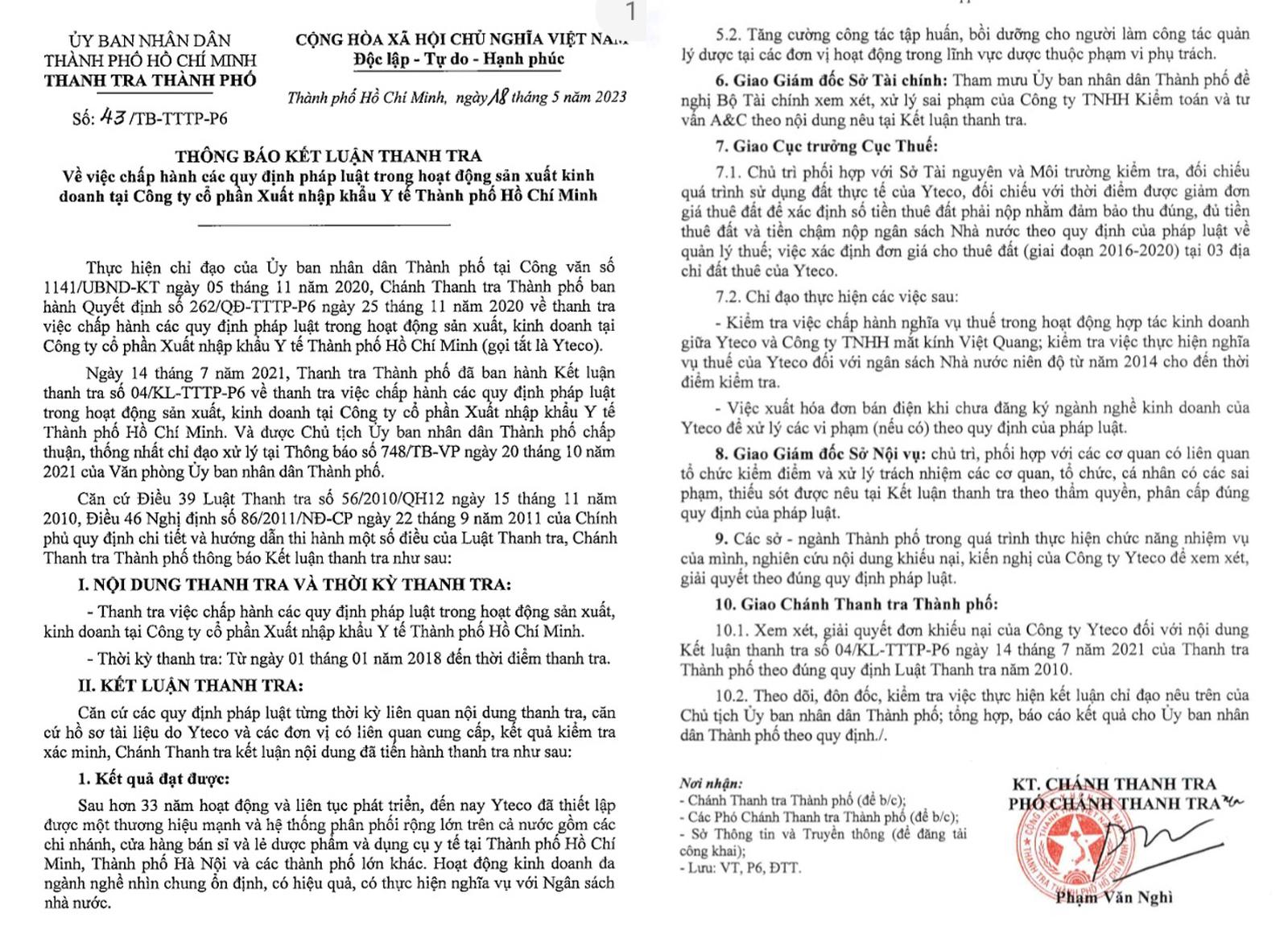 (Thanh tra) - Thanh tra TP Hồ Chí Minh đã ra Thông báo số 43/TB-TTTP-P6 ngày 18/5/2023 về kết luận thanh tra việc chấp hành các quy định pháp luật trong hoạt động sản xuất, kinh doanh tại Công ty Cổ phần Xuất nhập khẩu Y tế TP Hồ Chí Minh (gọi tắt là Yteco).