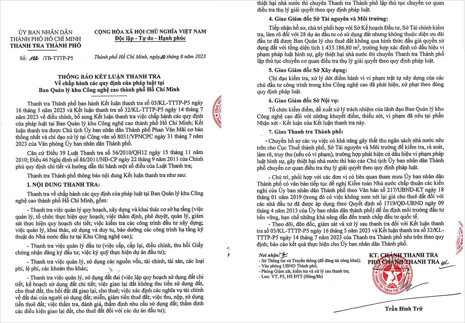 Chánh Thanh tra TP Hồ Chí Minh kiến nghị và đã được Chủ tịch UBND TP cơ bản thống nhất, chỉ đạo xử lý tại Văn bản số 8031/VP-NCPC ngày 31/7/2023 của Văn phòng UBND TP. Trong đó, giao Trưởng Ban Quản lý Khu Công nghệ cao tổ chức kiểm điểm trách nhiệm, xử lý theo thẩm quyền, phân cấp đúng quy định đối với tập thể, cá nhân có thiếu sót, khuyết điểm, vi phạm.
