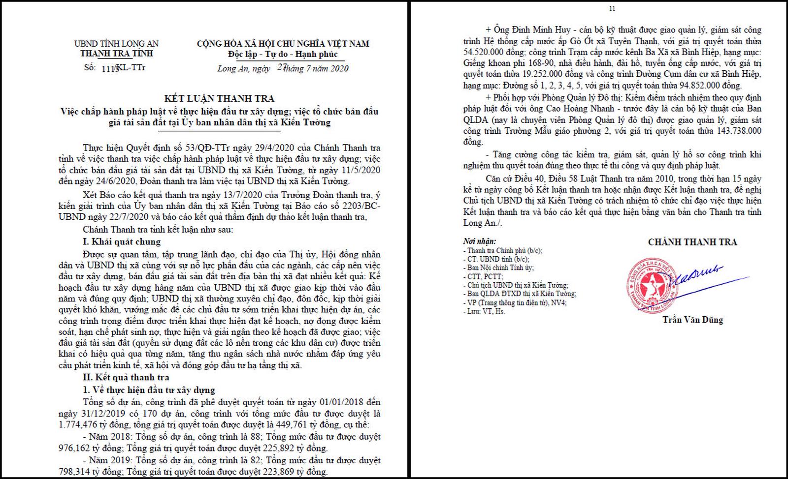 Chánh Thanh tra tỉnh Long An Trần Văn Dũng kết luận, UBND thị xã Kiến Tường phải chịu trách nhiệm trong việc cho chủ trương đấu giá các lô đất khi chưa hoàn chỉnh hạ tầng kỹ thuật đối với 3 khu: Khu đô thị sân bay giai đoạn 1, khu dân cư cặp đường vào Trường Chính trị và cụm dân cư khu phố 9 theo quy định tại khoản 1 Điều 41 Nghị định số 43/2014/NĐ-CP ngày 15/5/2014 của Chính phủ quy định chi tiết thi hành một số điều của Luật Đất đai.