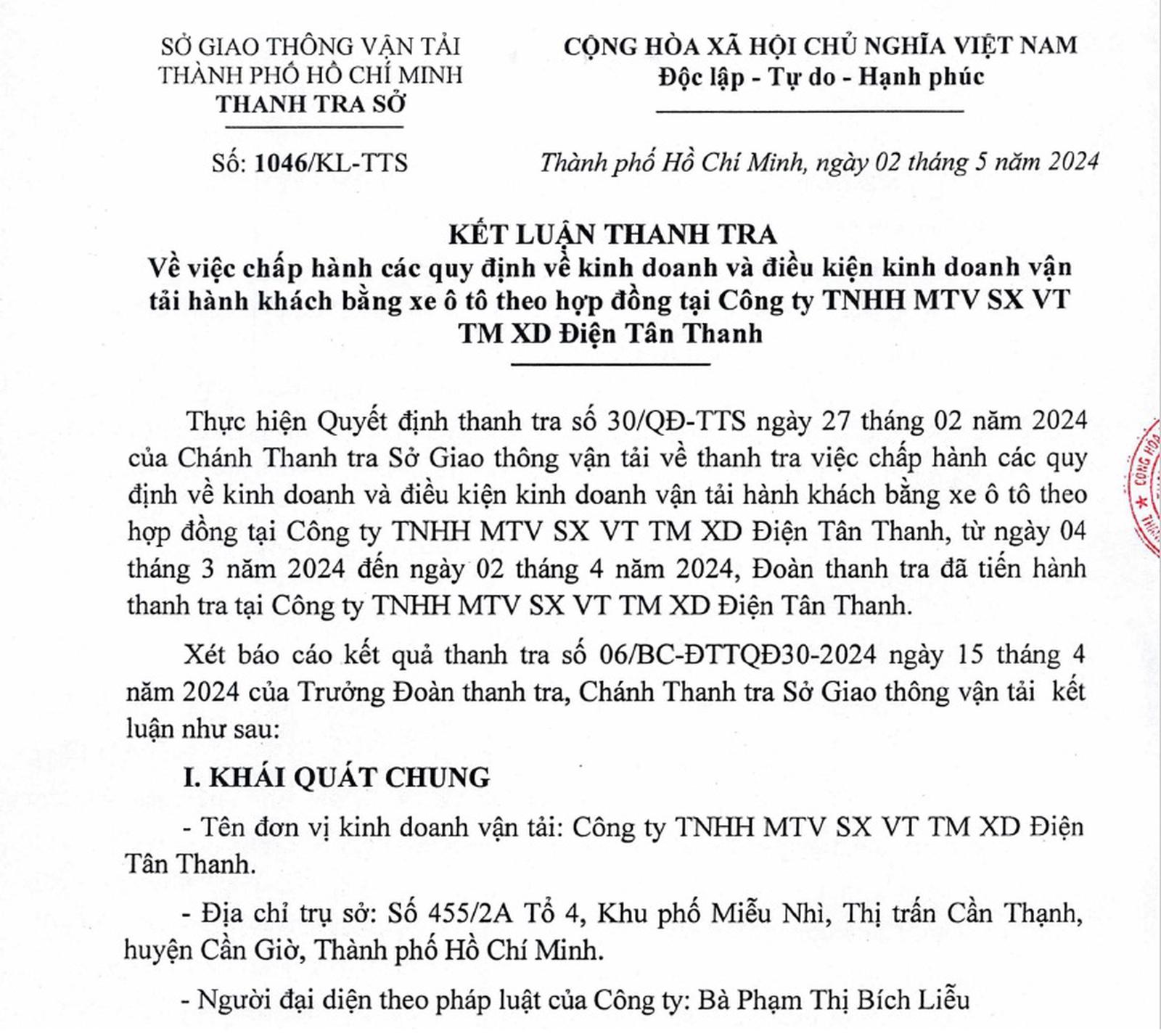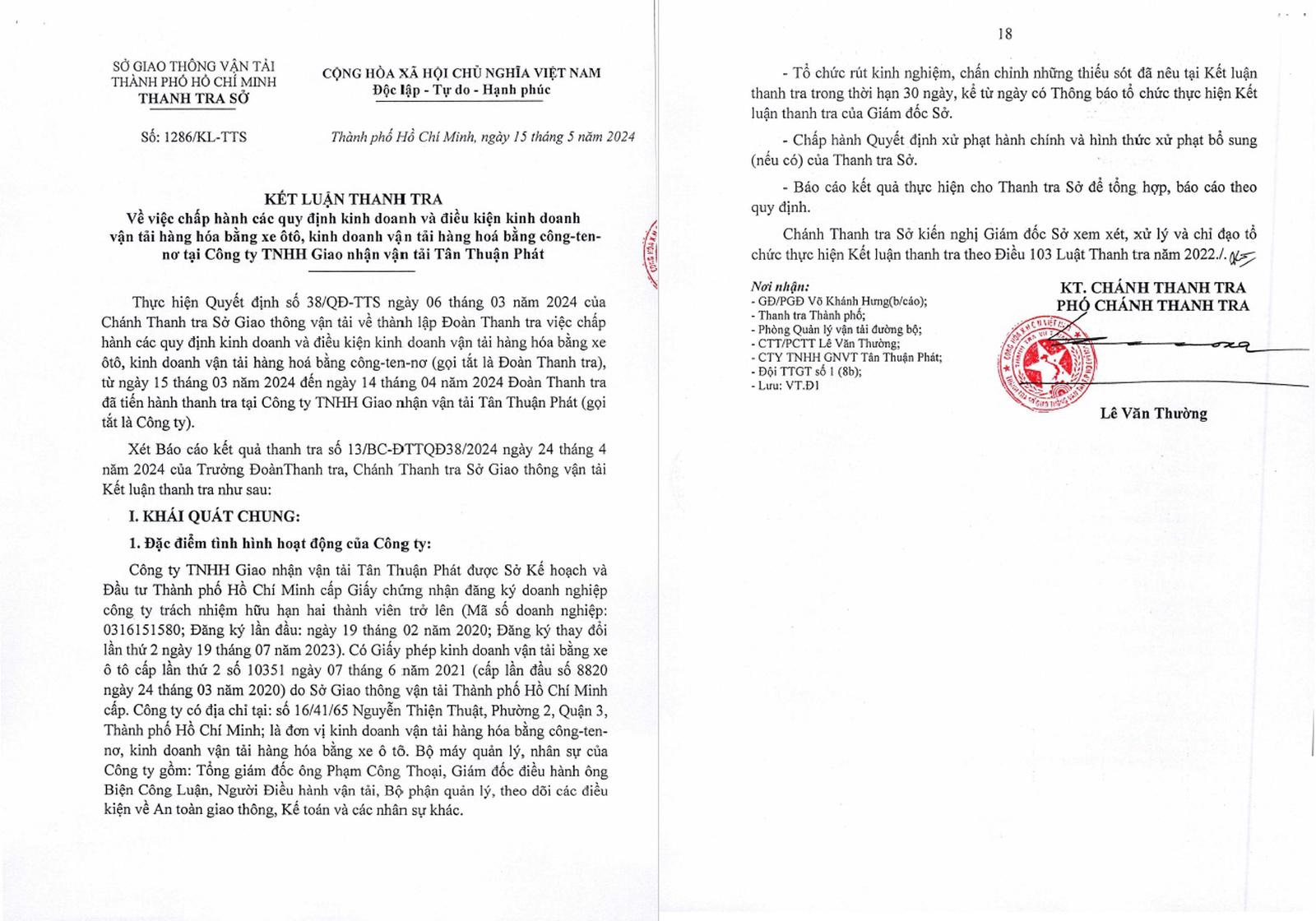 Ngày 15/5/2024, Thanh tra Sở GTVT đã ban hành Kết luận thanh tra số 1286/KL-TTS về thanh tra việc chấp hành các quy định kinh doanh và điều kiện kinh doanh vận tải hàng hóa bằng xe ô tô, kinh doanh vận tải hàng hóa bằng công-ten-nơ tại Công ty Tân Thuận Phát.