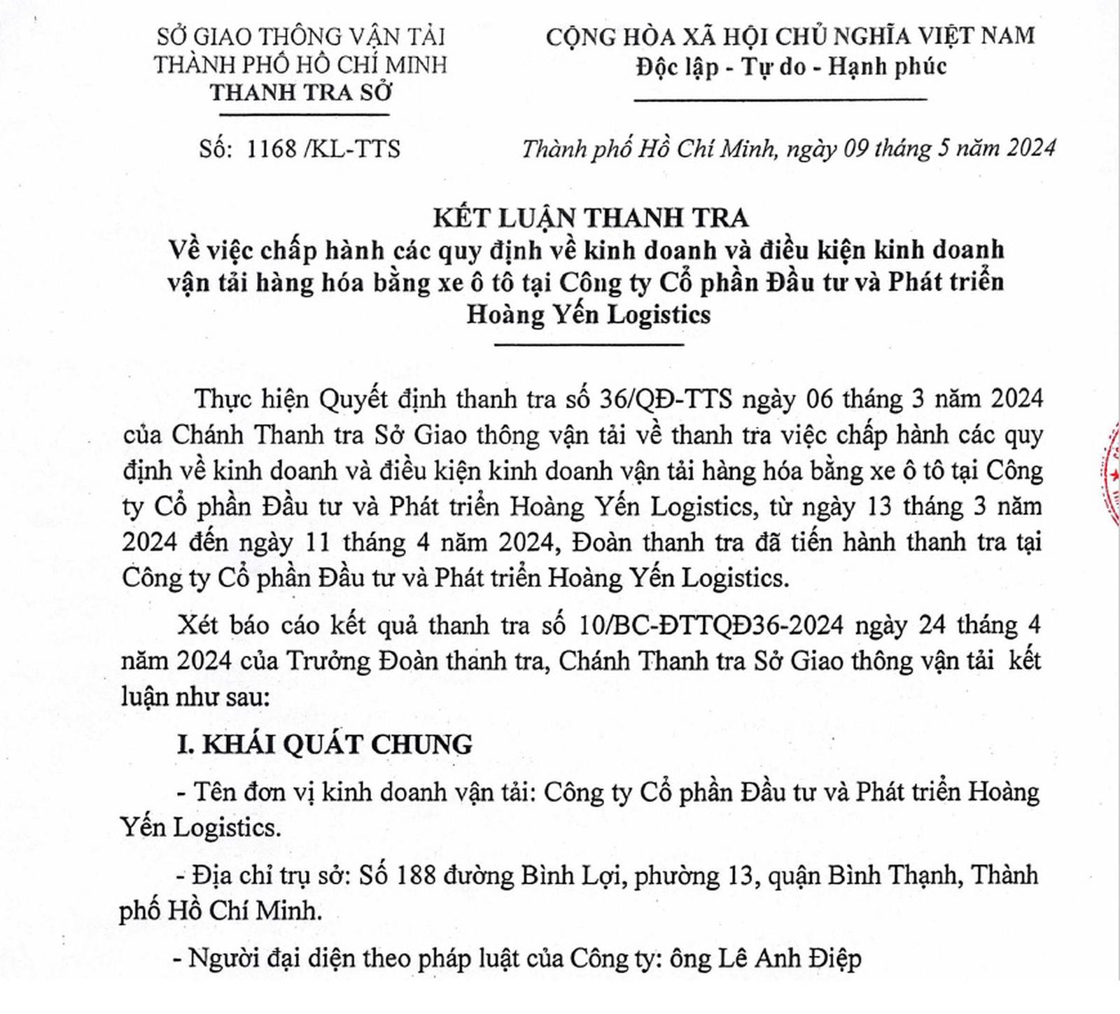 Trước đó, trong tháng 5/2024, Thanh tra Sở GTVT đã ban hành 2 kết luận thanh tra đối với Công ty TNHH MTV SX VT TM XD Điện Tân Thanh và Công ty Cổ phần (CP) Đầu tư và Phát triển Hoàng Yến Logistics.