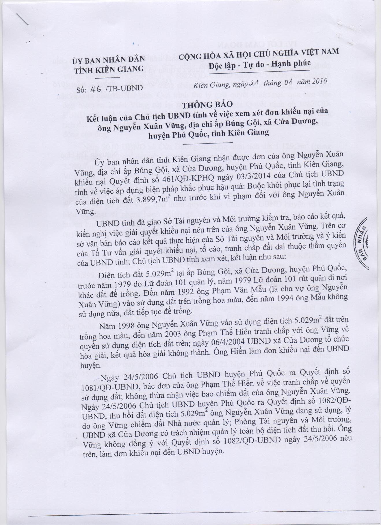 Ngày 24/5/2006, Chủ tịch UBND huyện Phú Quốc ra Quyết định số 1082 thu hồi đất diện tích 5.029m2 ông Nguyễn Xuân Vững đang sử dụng, lý do chiếm đất Nhà nước quản lý. Phòng Tài nguyên và Môi trường, UBND xã Cửa Dương có trách nhiệm quản lý toàn bộ diện tích đất thu hồi.