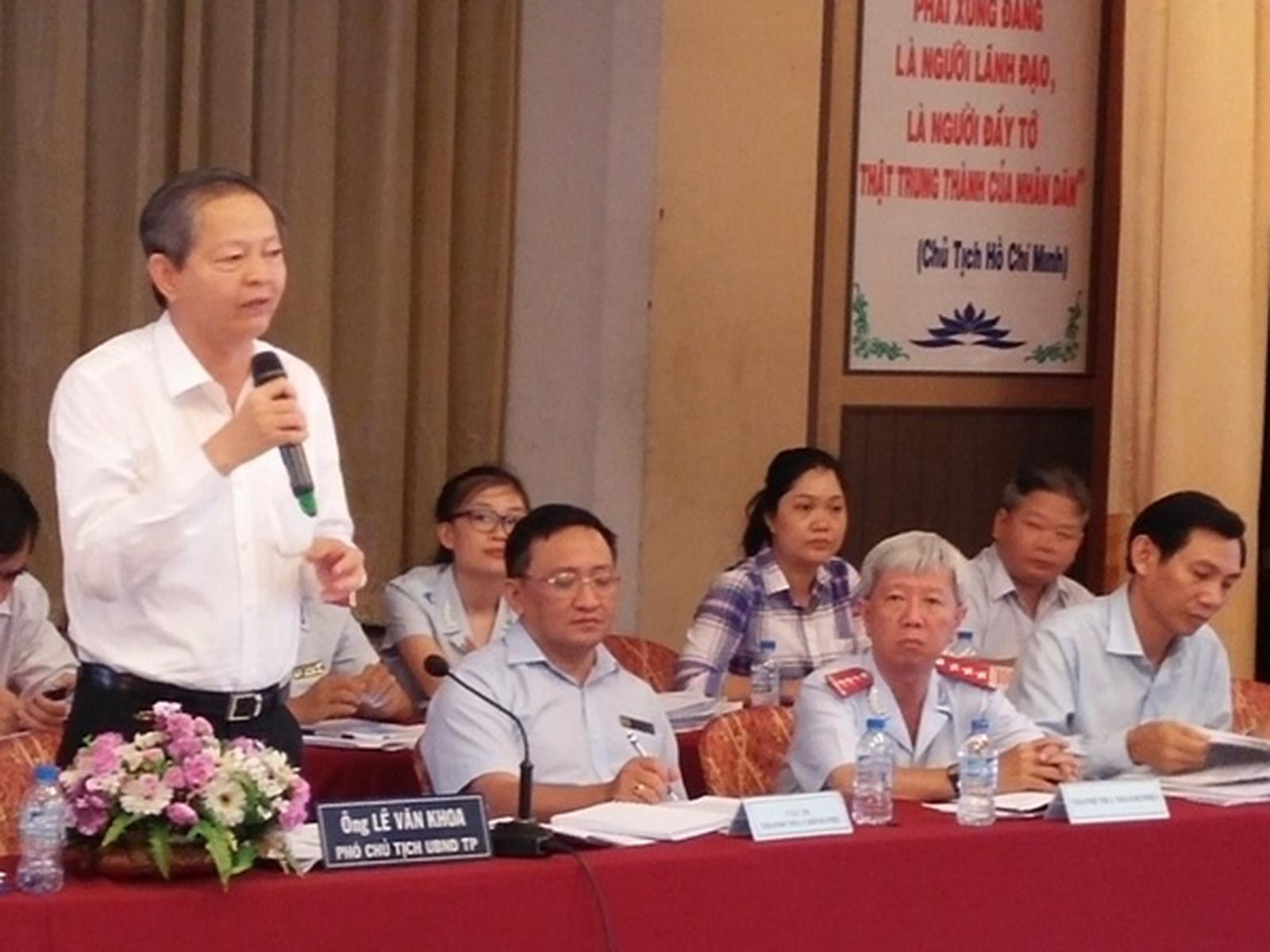 Tại buổi đối thoại ngày 15/3/2017, ông Lê Văn Khoa, Phó Chủ tịch UBND TP Hồ Chí Minh đã 3 lần xin lỗi 22 hộ dân. Ảnh: KQ