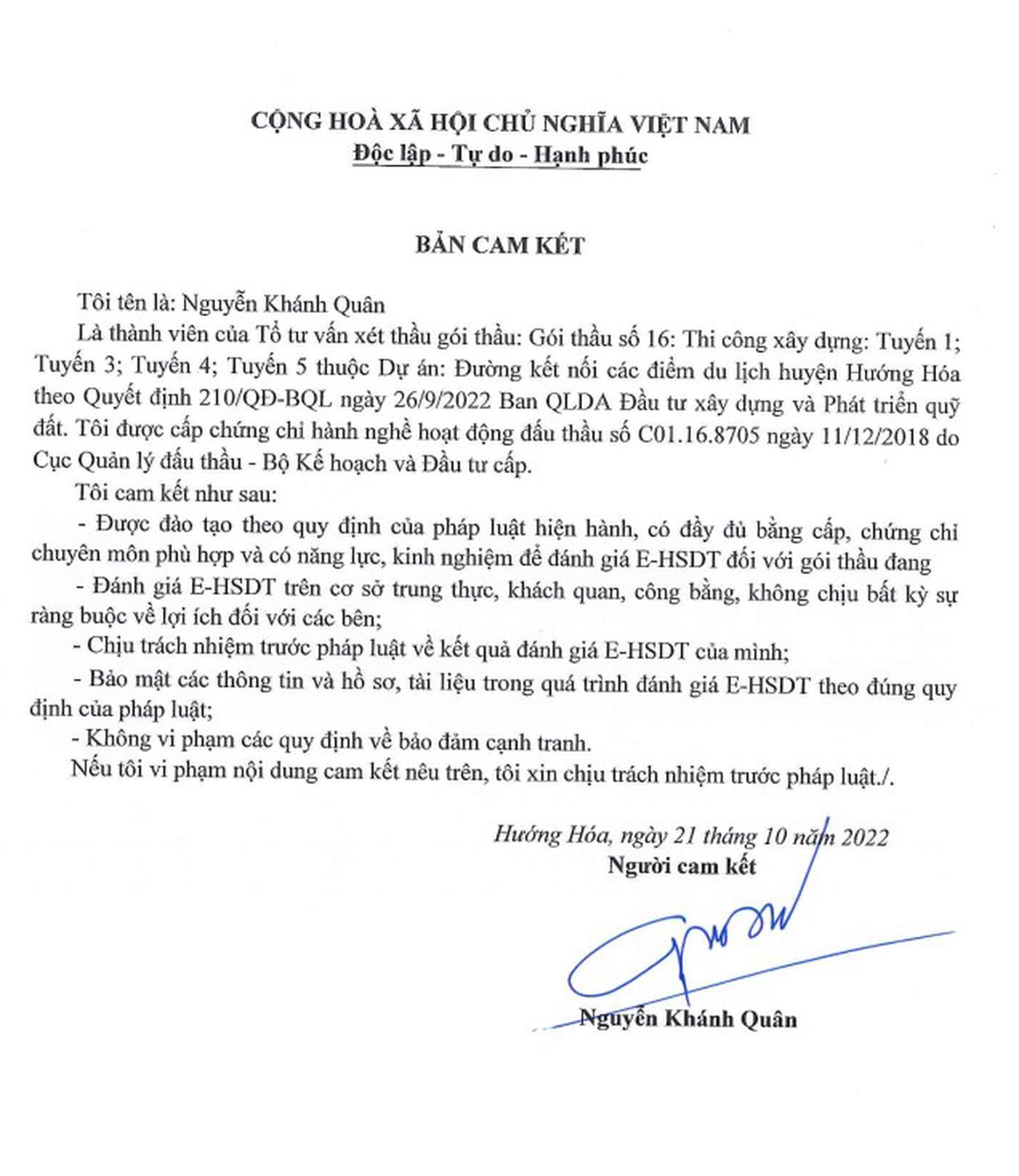 Đối với UBND huyện Hướng Hóa, Thanh tra tỉnh yêu cầu địa phương kiểm điểm, làm rõ trách nhiệm của tổ chức, cá nhân có liên quan trong quá trình chỉ đạo điều hành đối với công tác đấu thầu nêu trên. Trong đó, làm rõ trách nhiệm, xử lý nghiêm đối với Ban Giám đốc và các cá nhân có liên quan của Ban QLDA huyện Hướng Hoá do thiếu trách nhiệm dẫn đến vi phạm về đấu thầu đối với 2 gói thầu nêu trên. Đặc biệt, làm rõ trách nhiệm, xử lý nghiêm đối với ông Nguyễn Khánh Quân.
