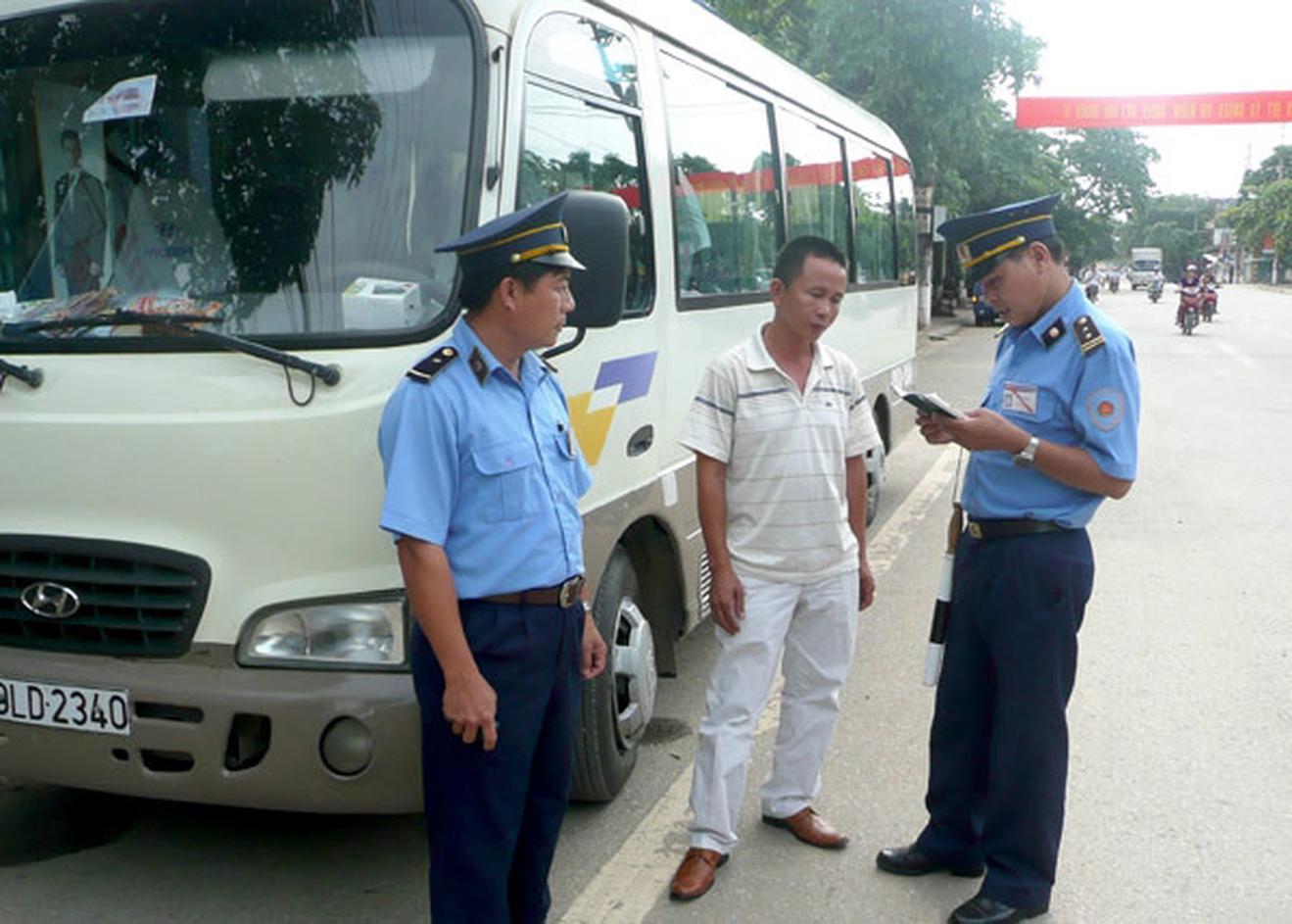 Thanh tra giao thông kiểm tra một xe khách chạy tuyến cố định liên tỉnh. Ảnh: TA