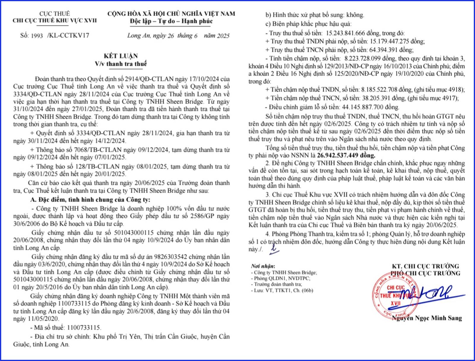 Chi cục Thuế khu vực XVII đã ban hành Kết luận thành tra số 1993/ KL-CCTKV17 ngày 26/6/2025 về việc thanh tra thuế tại Công ty TNHH Sheen Bridge (địa chỉ tại huyện Cần Giuộc, tỉnh Long An cũ, nay là xã Cần Giuộc, tỉnh Tây Ninh).