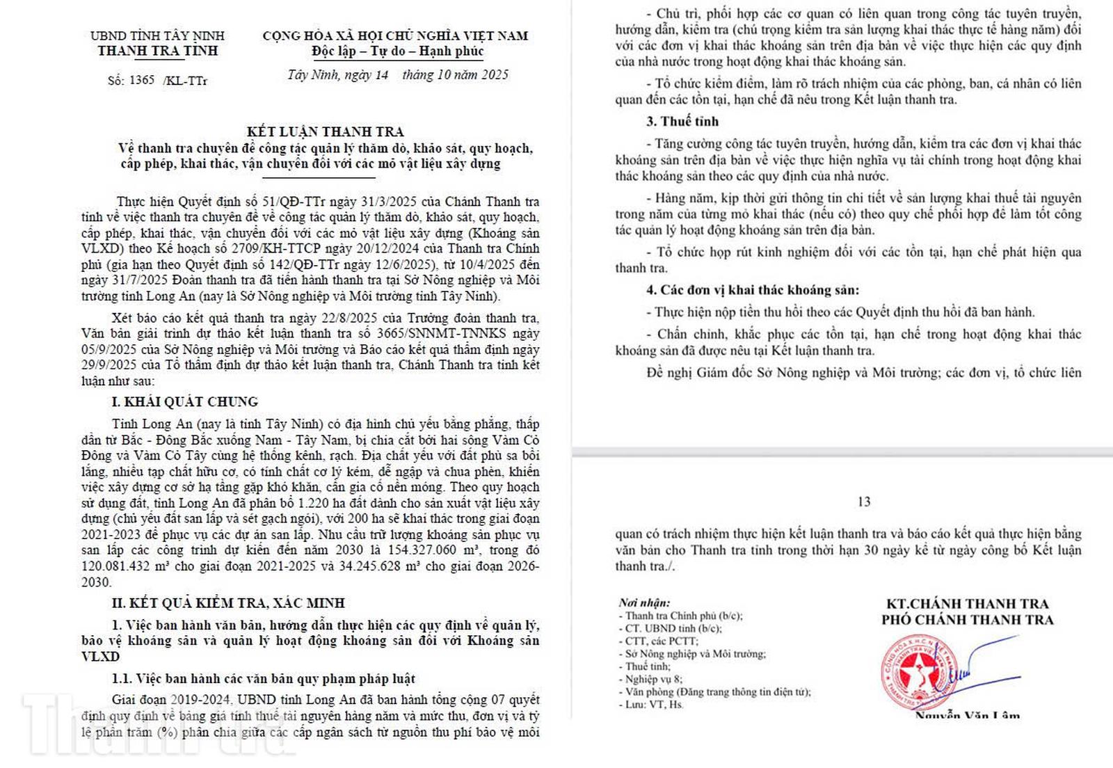 Thanh tra tỉnh Tây Ninh đã ban hành Kết luận thanh tra số 1365/KL-TTr ngày 14/10/2025 về việc thanh tra chuyên đề công tác quản lý thăm dò, khảo sát, quy hoạch, cấp phép, khai thác, vận chuyển đối với các mỏ vật liệu xây dựng. Việc thanh tra được tiến hành tại Sở Nông nghiệp và Môi trường tỉnh Long An (nay là Sở Nông nghiệp và Môi trường tỉnh Tây Ninh).