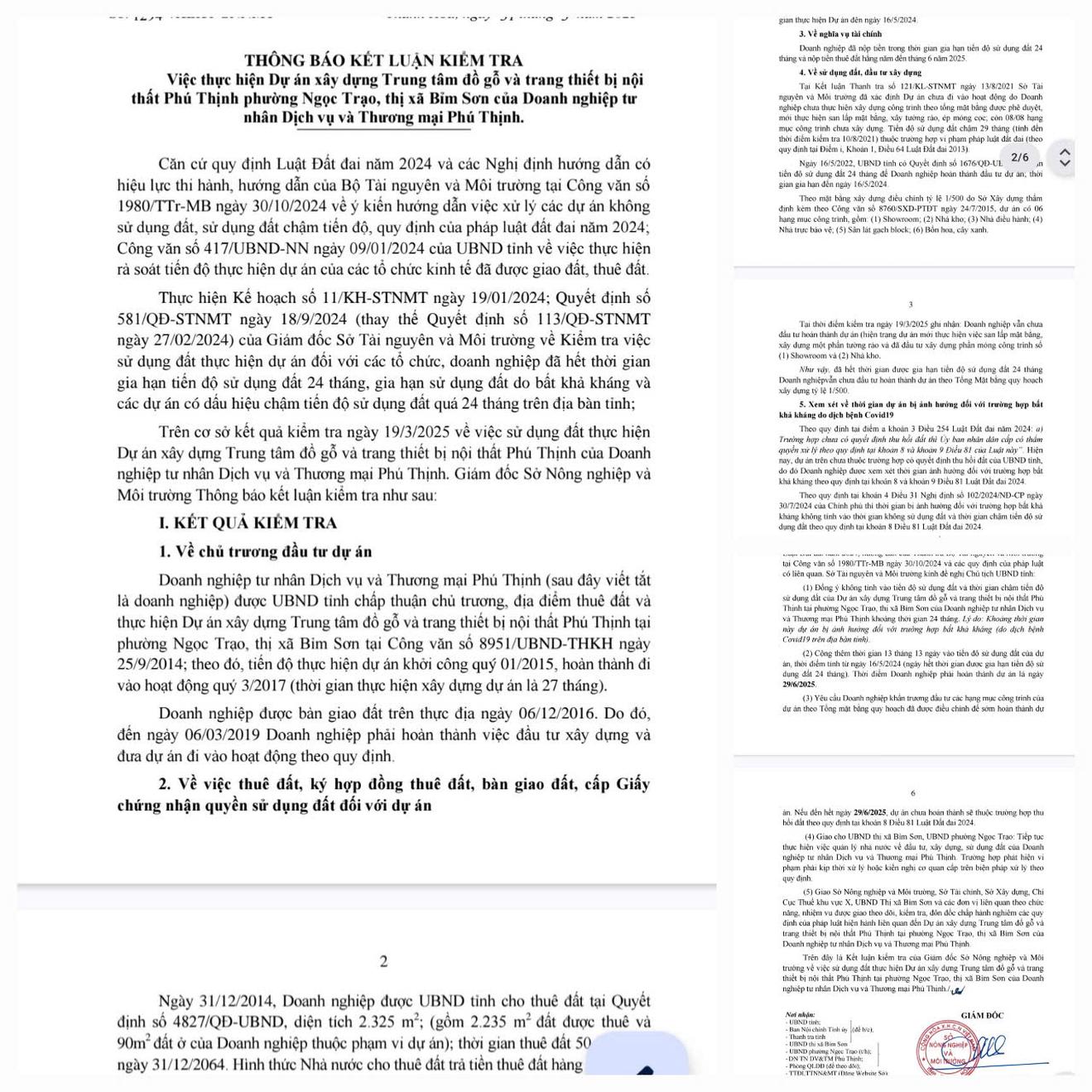 Căn cứ vào hồ sơ hiện có và kết quả kiểm tra thực tế tại đơn vị, đối chiếu với các quy định pháp luật, Giám đốc Sở Nông nghiệp và Môi trường kết luận: Việc sử dụng đất thực hiện dự án xây dựng Trung tâm đồ gỗ và trang thiết bị nội thất Phú Thịnh tại phường Ngọc Trạo, thị xã Bỉm Sơn của doanh nghiệp Phú Thịnh là vi phạm quy định tại điểm i, khoản 1, Điều 64 Luật Đất đai 2013, nay là khoản 8, Điều 81 Luật Đất đai 2024 do chậm tiến độ sử dụng đất quá 24 tháng doanh nghiệp được UBND tỉnh Thanh Hóa gia hạn tiến độ sử dụng đất 24 tháng để tiếp tục hoàn thành dự án tại Quyết định số 1676/QĐ-UBND ngày 16/5/2022 gia hạn cho doanh nghiệp 24 tháng để hoàn thành dự án.