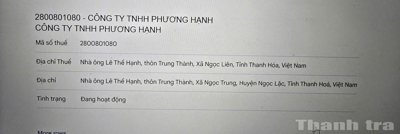 Thực hiện Quyết định số 1969/QĐ-TTTH ngày 8/8/2025, Thanh tra tỉnh Thanh Hóa đã tiến hành thanh tra việc chấp hành chính sách, pháp luật về thuế đối với Nhà nước tại Công ty TNHH Phương Hạnh (mã số thuế 2800801080, trụ sở tại thôn Trung Thành, xã Ngọc Liên, tỉnh Thanh Hóa).