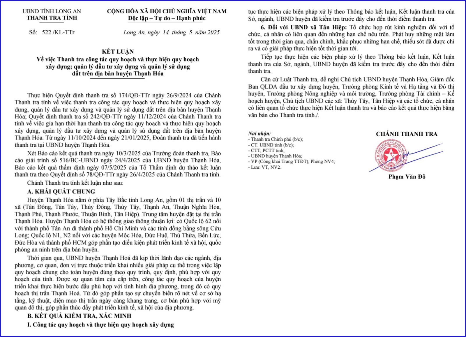 Chánh Thanh tra tỉnh Long An đã ban hành Kết luận thanh tra số 522 /KL-TTr ngày 14/5/2025 về việc thanh tra công tác quy hoạch và thực hiện quy hoạch xây dựng; quản lý đầu tư xây dựng và quản lý sử dụng đất trên địa bàn huyện Thạnh Hóa.