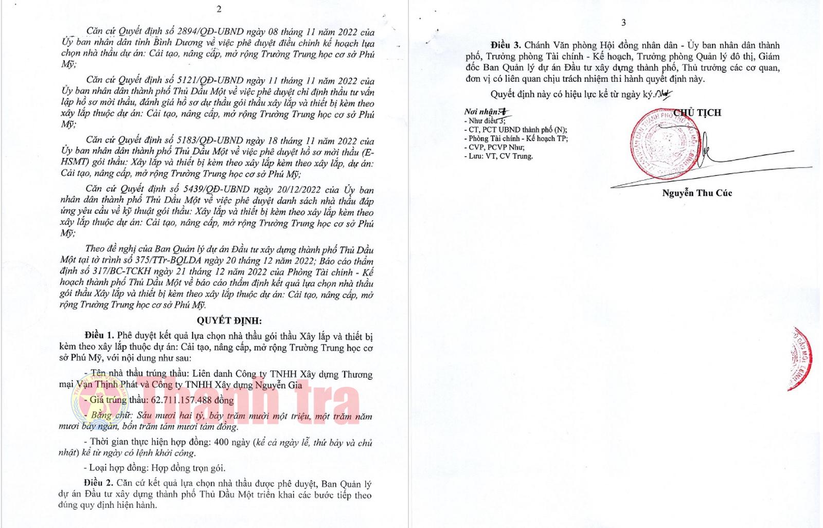 Gói thầu số 2: “Xây lắp và thiết bị kèm theo xây lắp” thuộc công trình Cải tạo, nâng cấp, mở rộng Trường THCS Phú Mỹ. Liên danh Công ty TNHH Xây dựng Thương mại Vạn Thịnh Phát và Công ty TNHH Xây dựng Nguyễn Gia là đơn vị trúng thầu với giá trúng thầu là hơn 62,711 tỷ đồng; Công ty TNHH Tư vấn Công nghệ Xây dựng Quang Minh là đơn vị tư vấn lựa chọn nhà thầu.