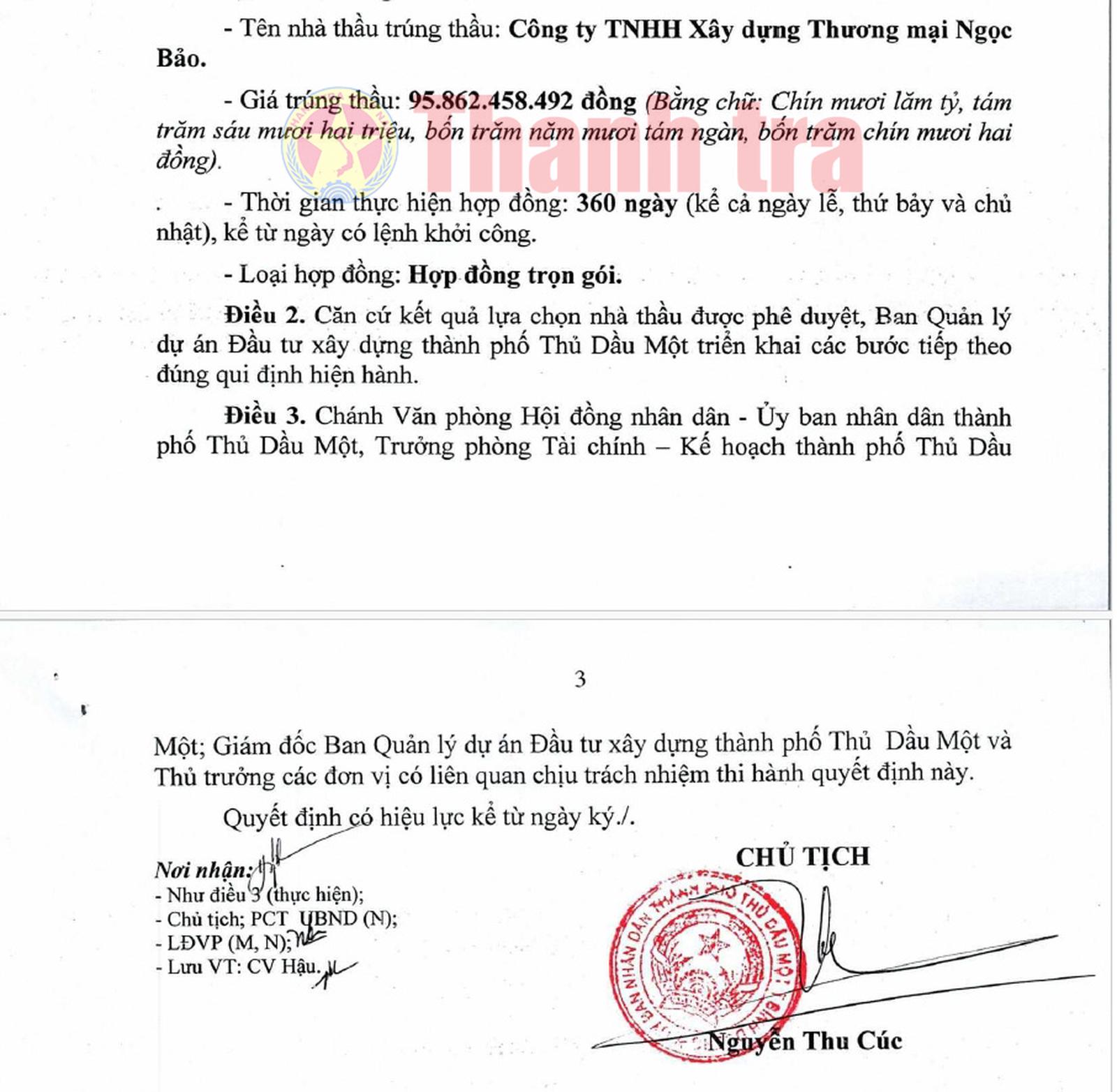 Bà Nguyễn Thu Cúc - Chủ tịch UBND thành phố Thủ Dầu Một ký quyết định phê duyệt Công ty TNHH Xây dựng Thương mại Ngọc Bảo là đơn vị trúng thầu. Ảnh: Thùy Dương