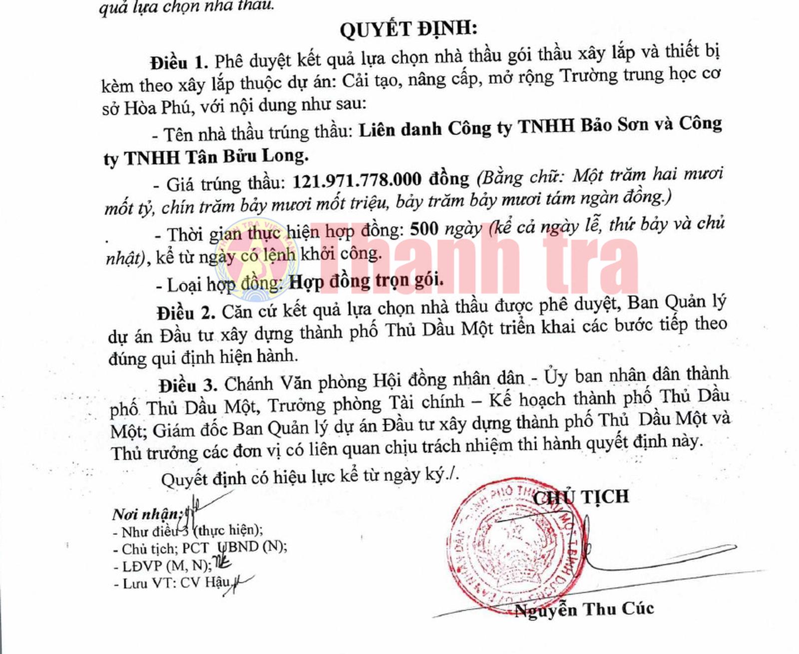 Gói thầu số 3: “Xây lắp và thiết bị kèm theo xây lắp” thuộc công trình Cải tạo, nâng cấp, mở rộng Trường THCS Hòa Phú. Liên danh Công ty TNHH Bảo Sơn và Công ty TNHH Tân Bửu Long là đơn vị trúng thầu với giá trúng thầu là hơn 121,971 tỷ đồng; Công ty Cổ phần Tư vấn Kỹ thuật Xây dựng Đô thị Liên Thành là đơn vị tư vấn lựa chọn nhà thầu.