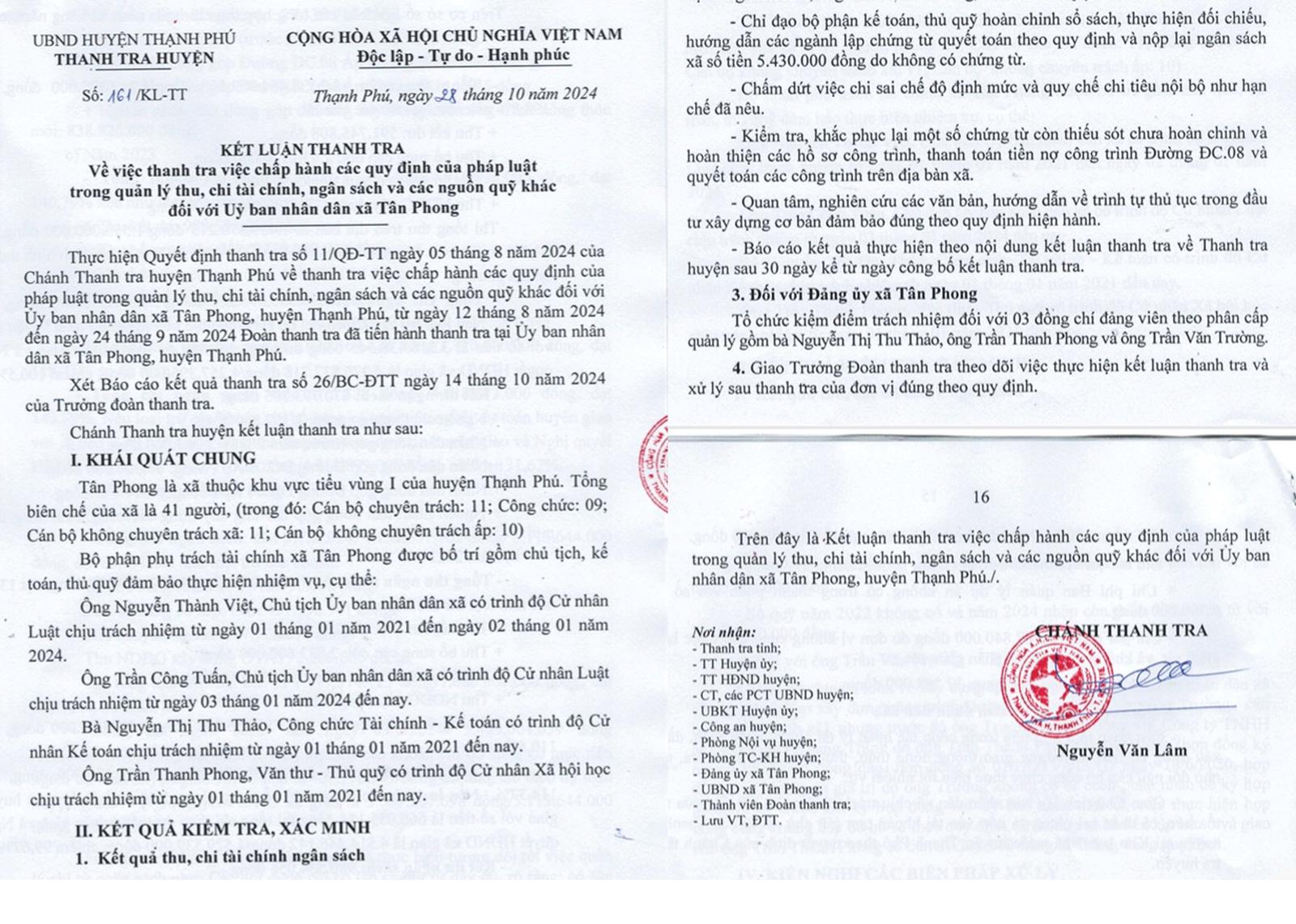 Kết luận thanh tra của Thanh tra huyện Thạnh Phú. Ảnh: Thu Huyền