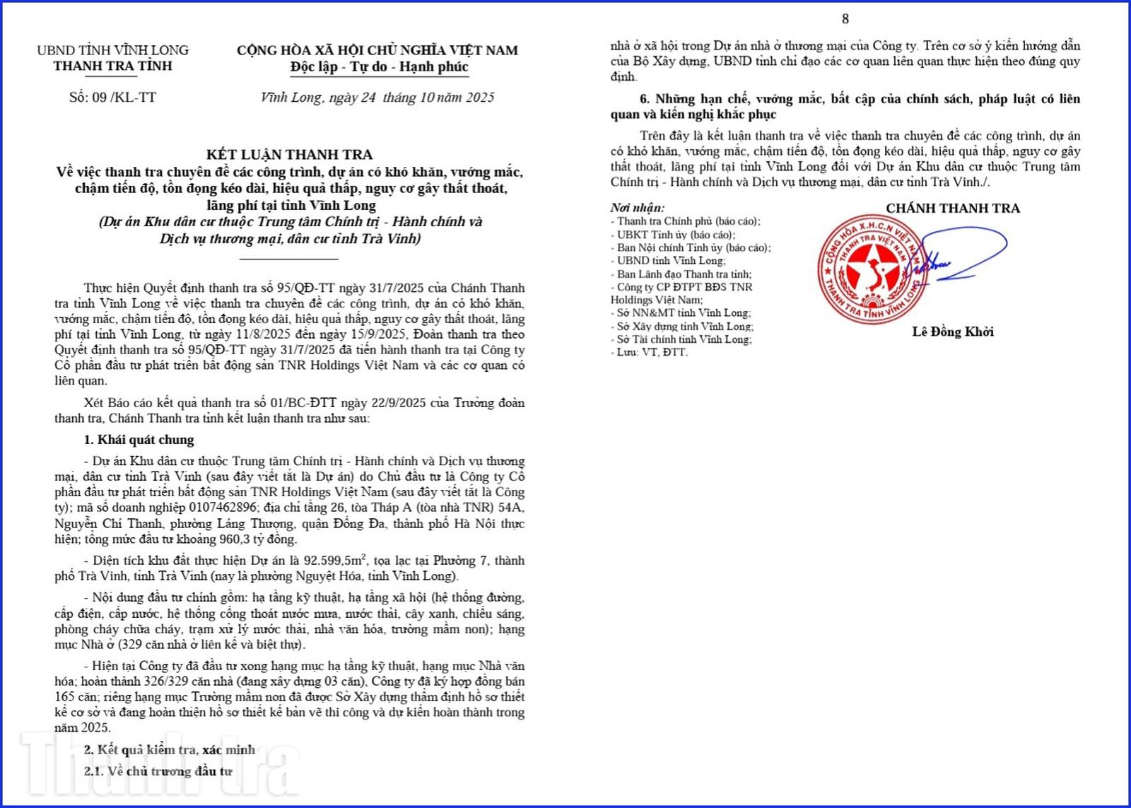 Thanh tra tỉnh Vĩnh Long đã ban hành Kết luận thanh tra số 09/KL-TT ngày 24/10/2025 về việc thanh tra chuyên đề các công trình, dự án có khó khăn, vướng mắc, chậm tiến độ, tồn đọng kéo dài, hiệu quả thấp, nguy cơ gây thất thoát, lãng phí tại tỉnh Vĩnh Long, đối với Dự án Khu dân cư thuộc Trung tâm Chính trị - Hành chính và Dịch vụ thương mại, dân cư tỉnh Trà Vinh.
