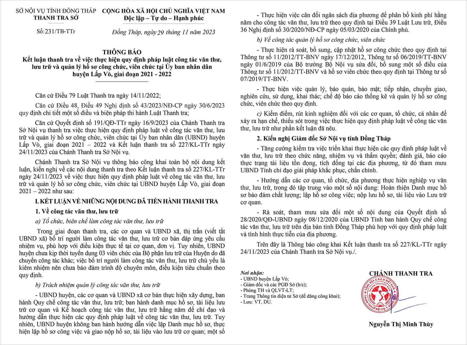 Chánh Thanh tra Sở Nội vụ Đồng Tháp đã ban hành Văn bản số 231/TB-TTr ngày 29/11/2023 thông báo kết luận thanh tra việc thực hiện quy định pháp luật công tác văn thư, lưu trữ và quản lý hồ sơ công chức, viên chức tại UBND huyện Lấp Vò, giai đoạn 2021 - 2022.