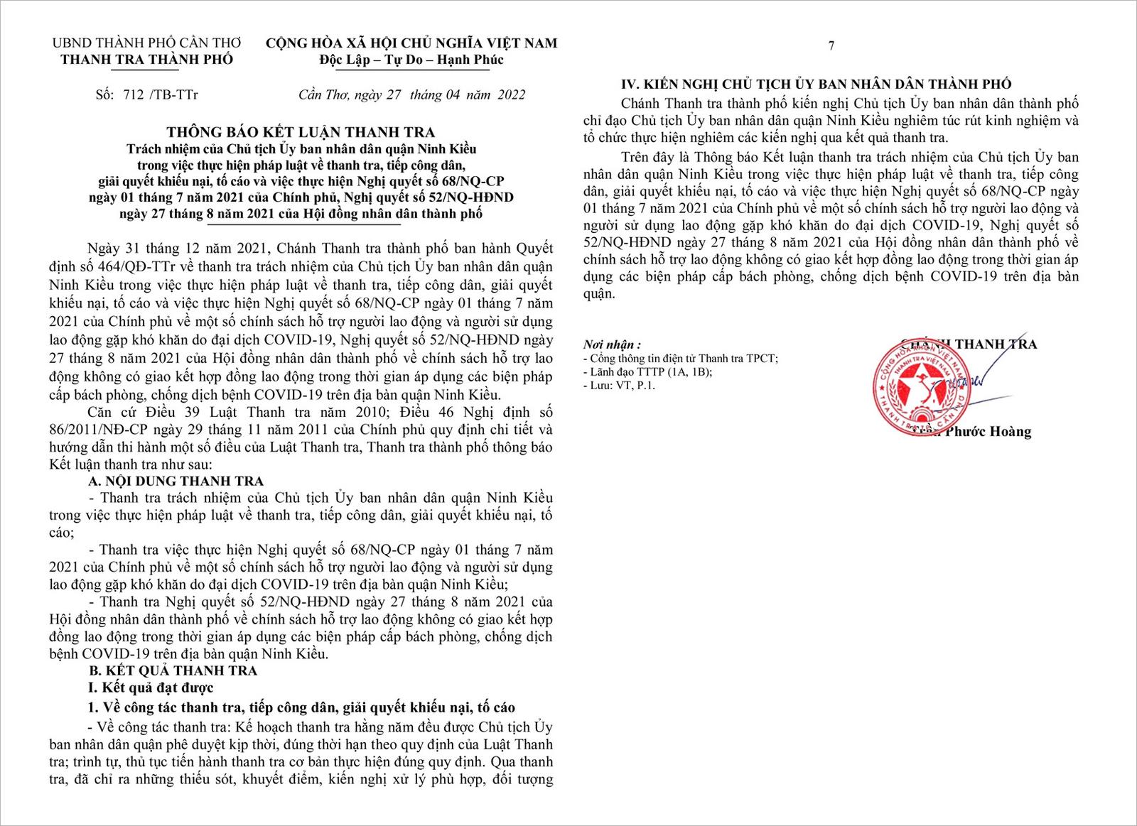 Thanh tra TP Cần Thơ vừa ban hành thông báo kết luận thanh tra trách nhiệm của Chủ tịch UBND quận Ninh Kiều trong việc thực hiện pháp luật về thanh tra, tiếp công dân, giải quyết khiếu nại, tố cáo và việc thực hiện Nghị quyết số 68/NQ-CP ngày 1/7/2021 của Chính phủ, Nghị quyết số 52/NQ-HĐND ngày 27/8/2021 của HĐND TP.