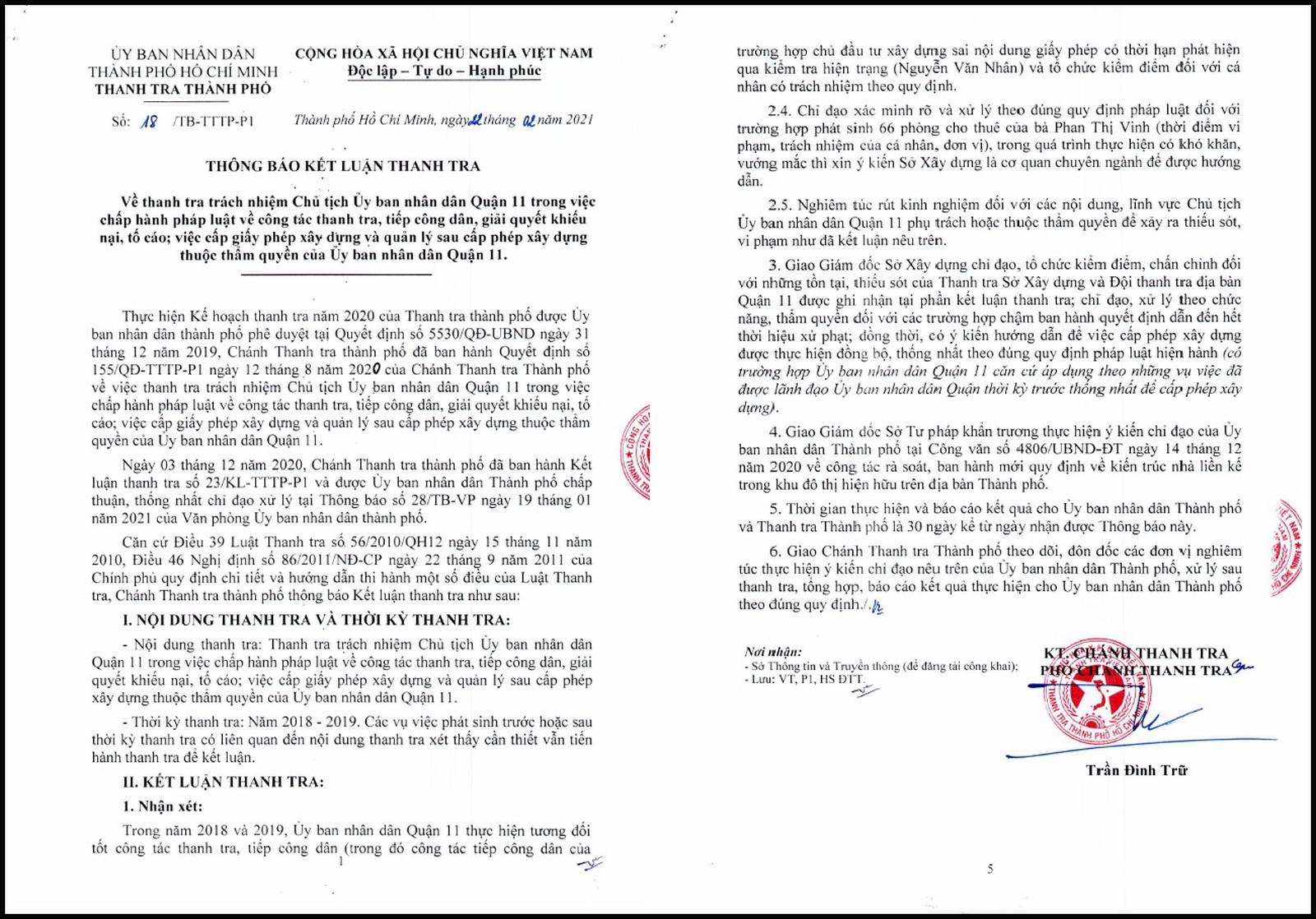 Mới đây, Thanh tra TP HCM đã công khai Kết luận thanh tra số 23/KL-TTTP-P1 về thanh tra trách nhiệm Chủ tịch UBND quận 11 trong việc chấp hành pháp luật về công tác thanh tra, tiếp công dân, giải quyết khiếu nại, tố cáo (KN, TC); việc cấp phép xây dựng và quản lý sau cấp phép xây dựng.