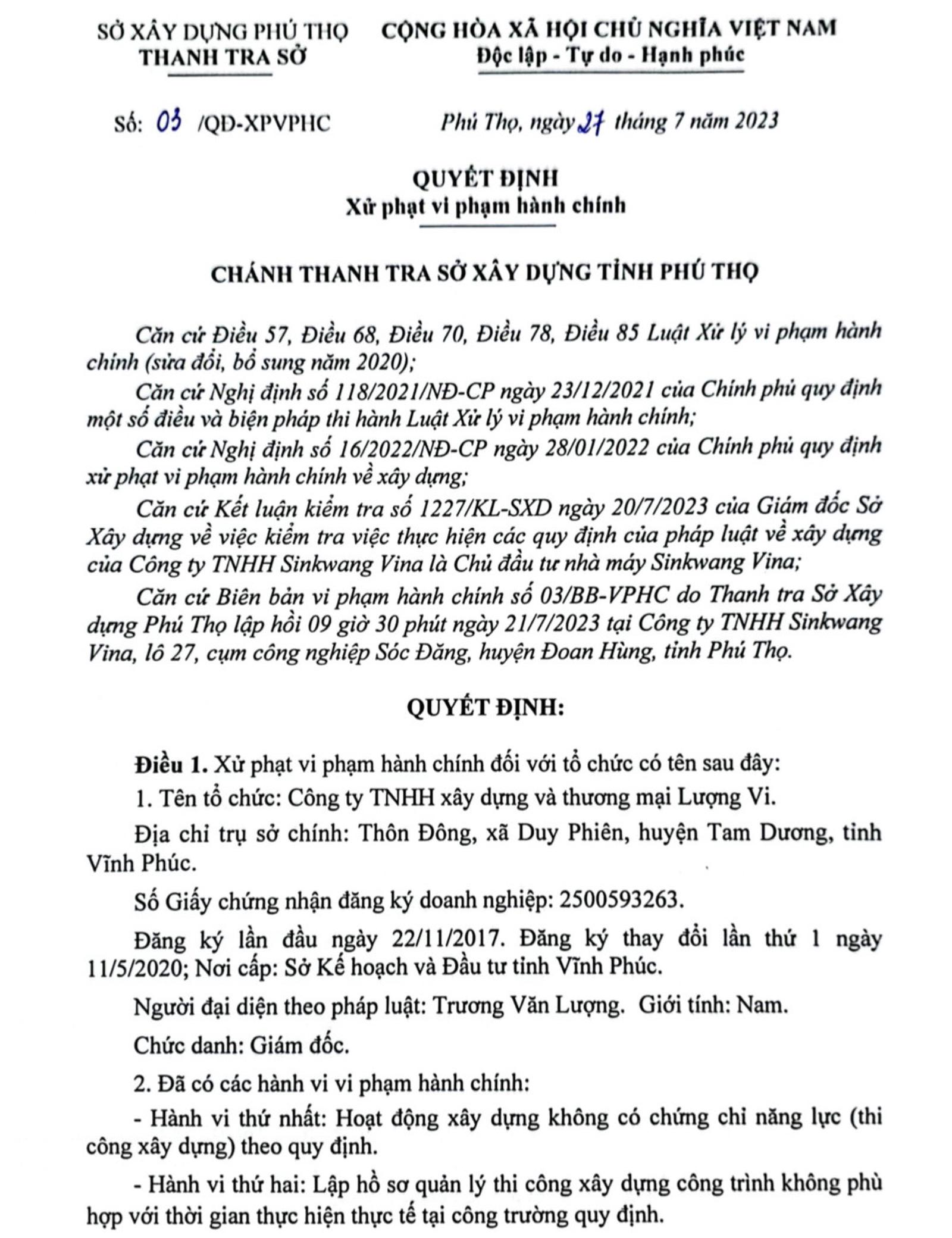(Thanh tra) - Qua công tác kiểm tra việc thực hiện các quy định của pháp luật về xây dựng của Công ty TNHH Sinkwang Vina - chủ đầu tư Nhà máy Sinkwang Vina tại Cụm công nghiệp Sóc Đăng, huyện Đoan Hùng; Sở Xây dựng Phú Thọ đã xử phạt Công ty TNHH Sinkwang Vina và 2 đơn vị liên quan 565 triệu đồng.