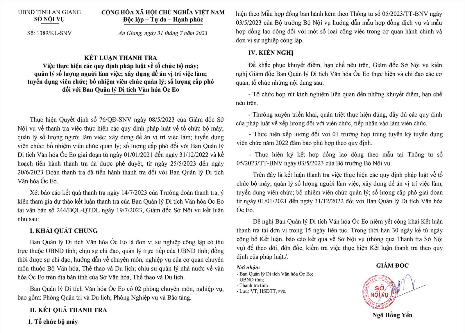 Sở Nội vụ An Giang đã ban hành Kết luận thanh tra số 1389/KL-SNV ngày 31/7/2023 về việc thực hiện các quy định pháp luật về tổ chức bộ máy; quản lý số lượng người làm việc; xây dựng đề án vị trí việc làm; tuyển dụng viên chức; bổ nhiệm viên chức quản lý; số lượng cấp phó đối với Ban Quản lý Di tích Văn hóa Óc Eo.