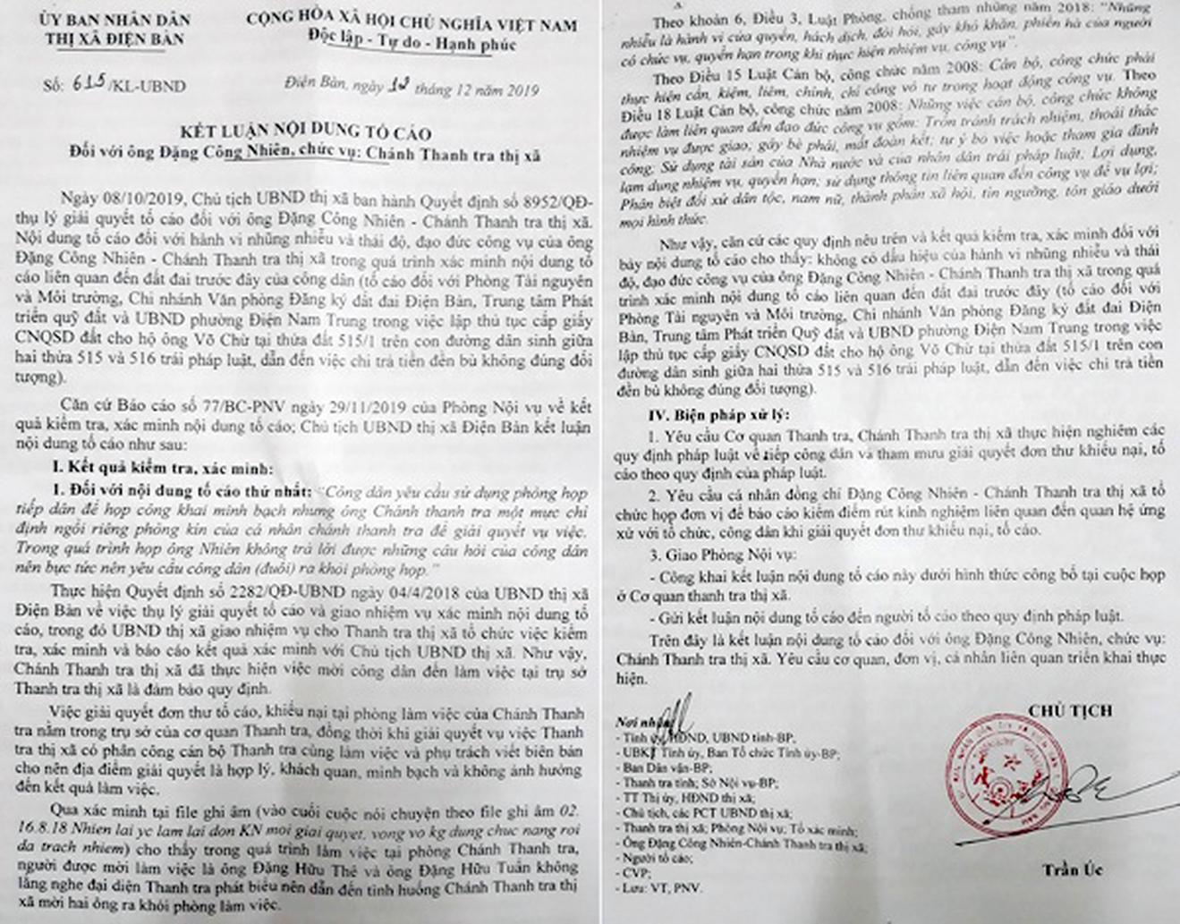 Kết luận nội dung tố cáo Chánh Thanh tra Đặng Công Nhiên của Chủ tịch UBND thị xã Điện Bàn (Quảng Nam). Ảnh: P.V