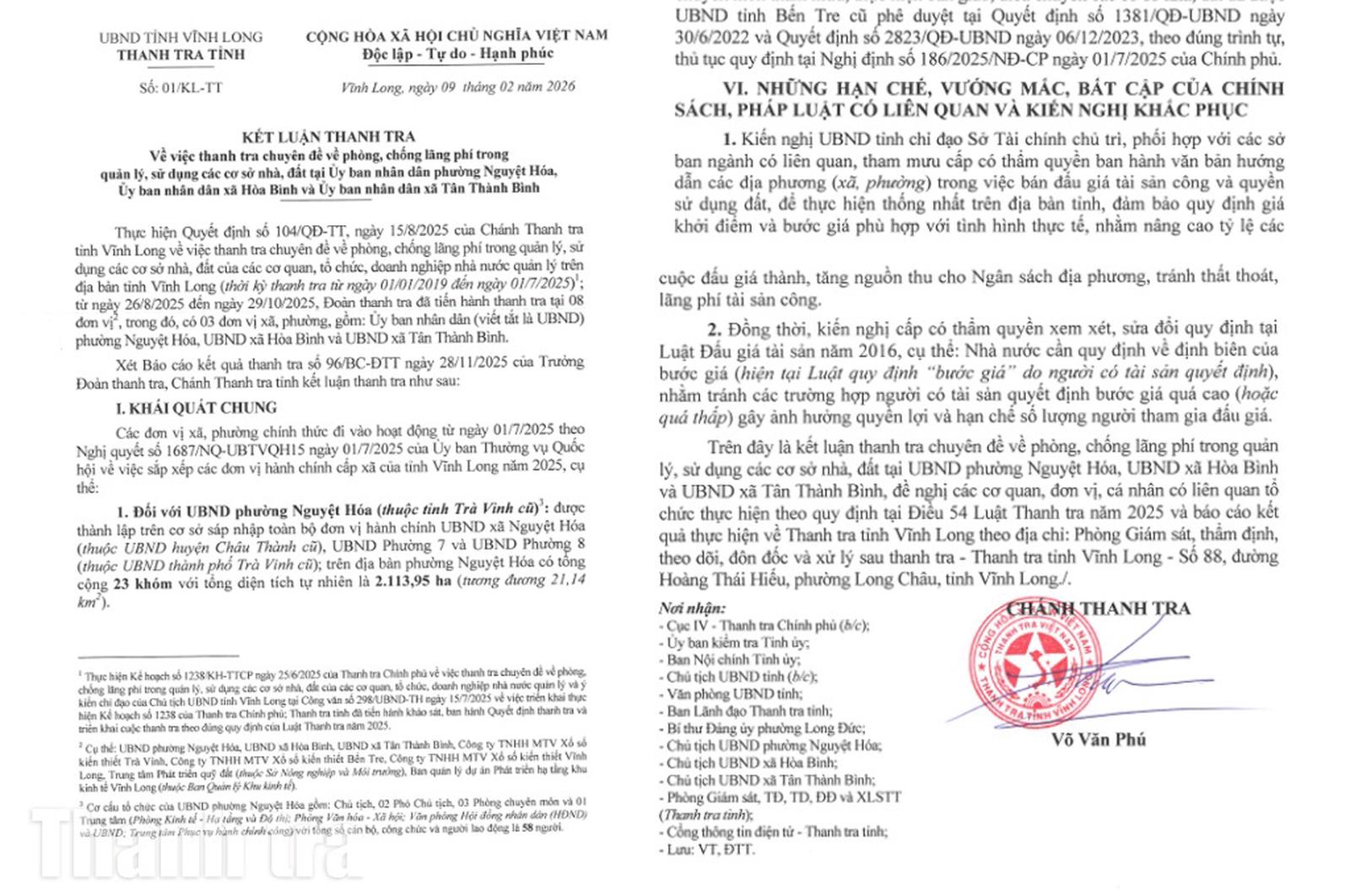 Thanh tra tỉnh Vĩnh Long đã ban hành Kết luận thanh tra số 01/KL-TT ngày 9/2/2026 về việc thanh tra chuyên đề về phòng, chống lãng phí trong quản lý, sử dụng các cơ sở nhà, đất tại UBND phường Nguyệt Hóa và UBND xã Hòa Bình, UBND xã Tân Thành Bình. Thời kỳ từ ngày 1/1/2019 đến 1/7/2025.