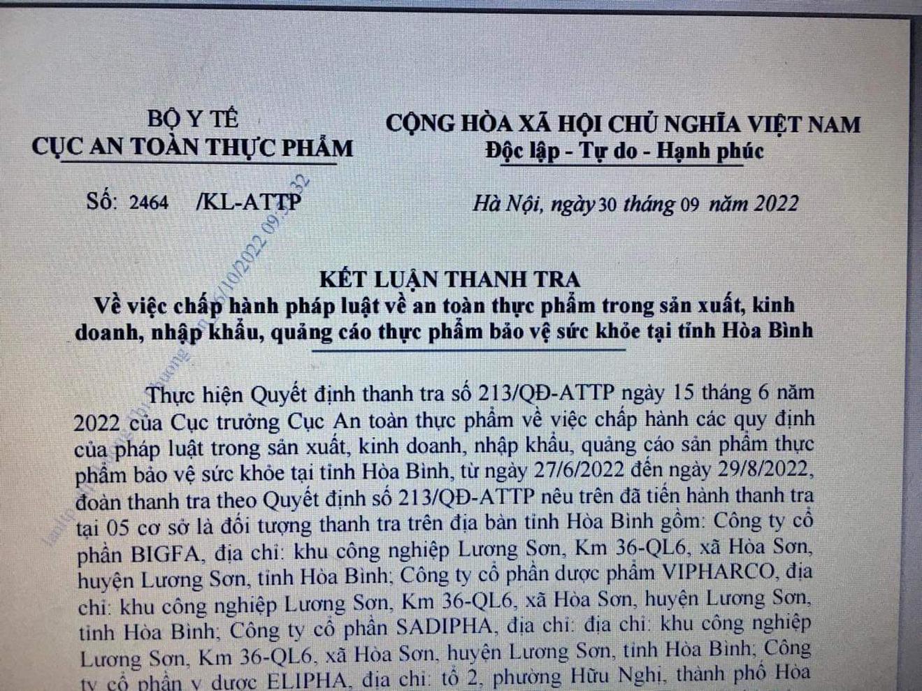 Tại thời điểm thanh tra, Cục ATTP không phát hiện vi phạm hành chính đối với Công ty Cổ phần Sadipha và Công ty Cổ phần Y Dược Elipha. Đoàn thanh tra đã yêu cầu 2 công ty thực hiện đúng các quy định của pháp luật trong trong sản xuất, kinh doanh và quảng cáo sản phẩm thực phẩm bảo vệ sức khỏe.