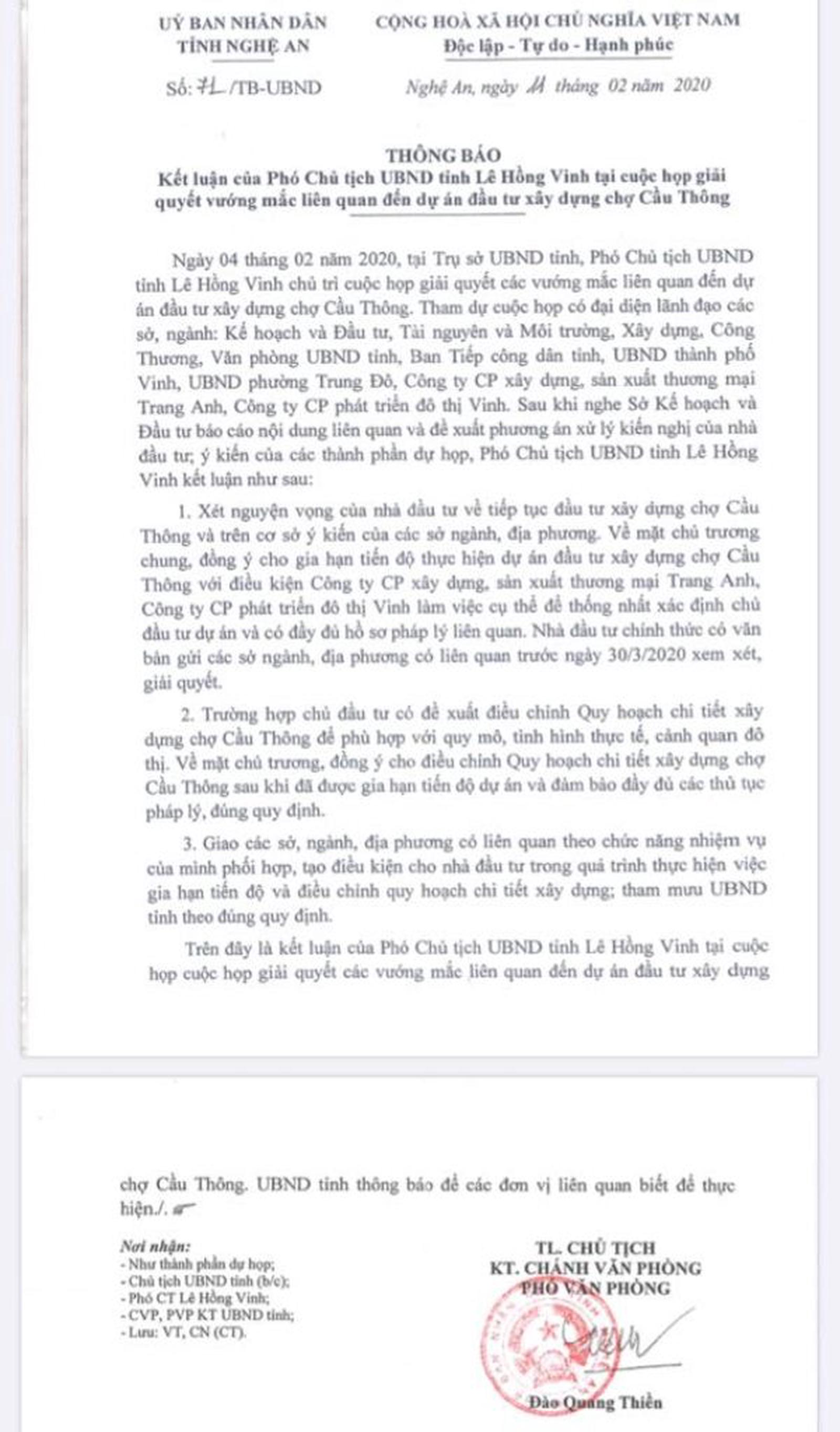 Phó Chủ tịch UBND tỉnh Lê Hồng Vinh kết luận: Xét nguyện vọng của nhà đầu tư về tiếp tục đầu tư xây dựng chợ Cầu Thông và trên cơ sở ý kiến của các sở, ngành, địa phương. Về mặt chủ trương, đồng ý cho gia hạn tiến độ thực hiện dự án đầu tư xây dựng chợ Cầu Thông với điều kiện Công ty CP xây dựng, sản xuất Thương mại Trang Anh, Cty CP phát triển đô thị Vinh làm việc cụ thể để thống nhất xác định chủ đầu tư dự án và có đầy đủ hồ sơ pháp lý liên quan. Nhà đầu tư chính thức có văn bản gửi các sở, ngành, địa phương có liên quan trước ngày 30/3/2020 xem xét, giải quyết.
