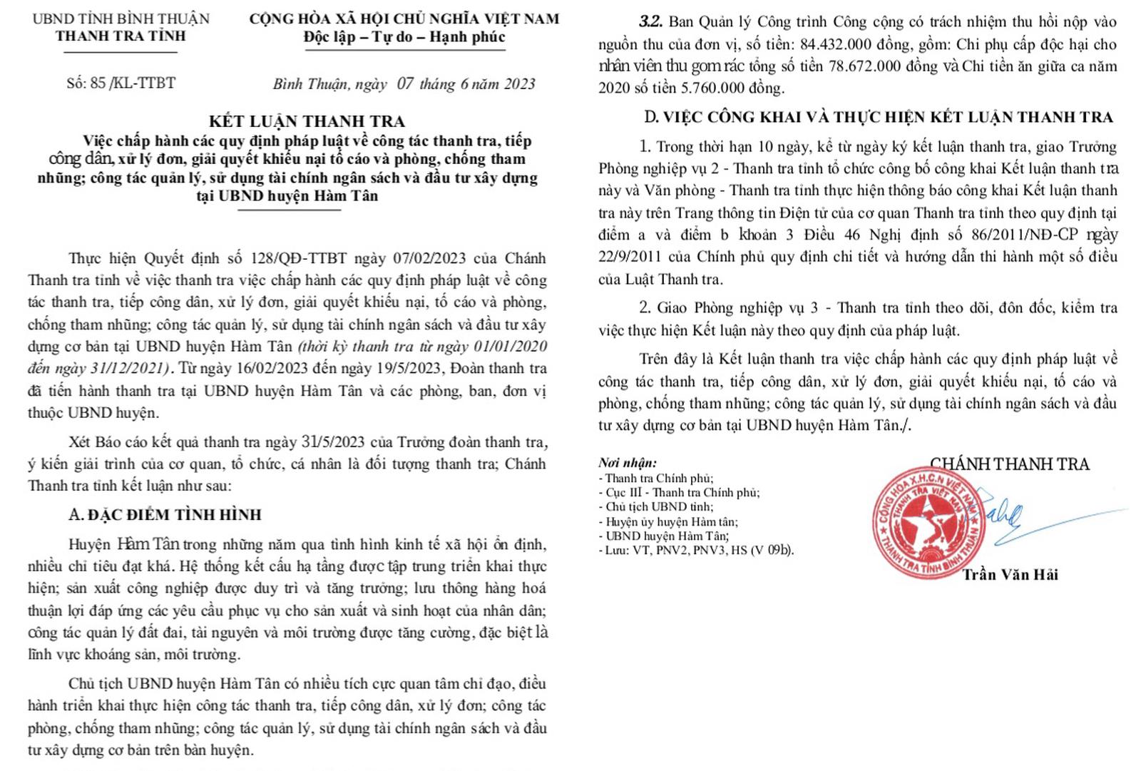 (Thanh tra) - Thanh tra tỉnh Bình Thuận ban hành Kết luận thanh tra (KLTT) số 85/KL-TTBT ngày 7/6/2023 về việc chấp hành các quy định pháp luật về công tác thanh tra, tiếp công dân, xử lý đơn, giải quyết khiếu nại tố cáo và phòng, chống tham nhũng; công tác quản lý, sử dụng tài chính ngân sách và đầu tư xây dựng tại UBND huyện Hàm Tân.