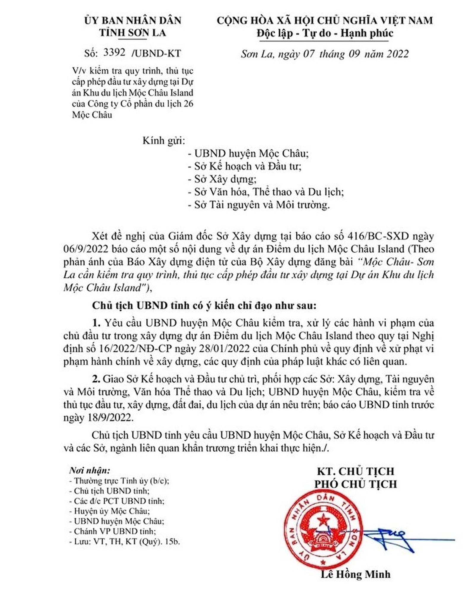 “UBND tỉnh Sơn La báo cáo kết quả kiểm tra, xử lý về Thanh tra Bộ Xây dựng để báo cáo Bộ trưởng Bộ Xây dựng đối với các vi phạm tại dự án điểm du lịch Mộc Châu Island” - Thanh tra Bộ Xây dựng đề nghị.