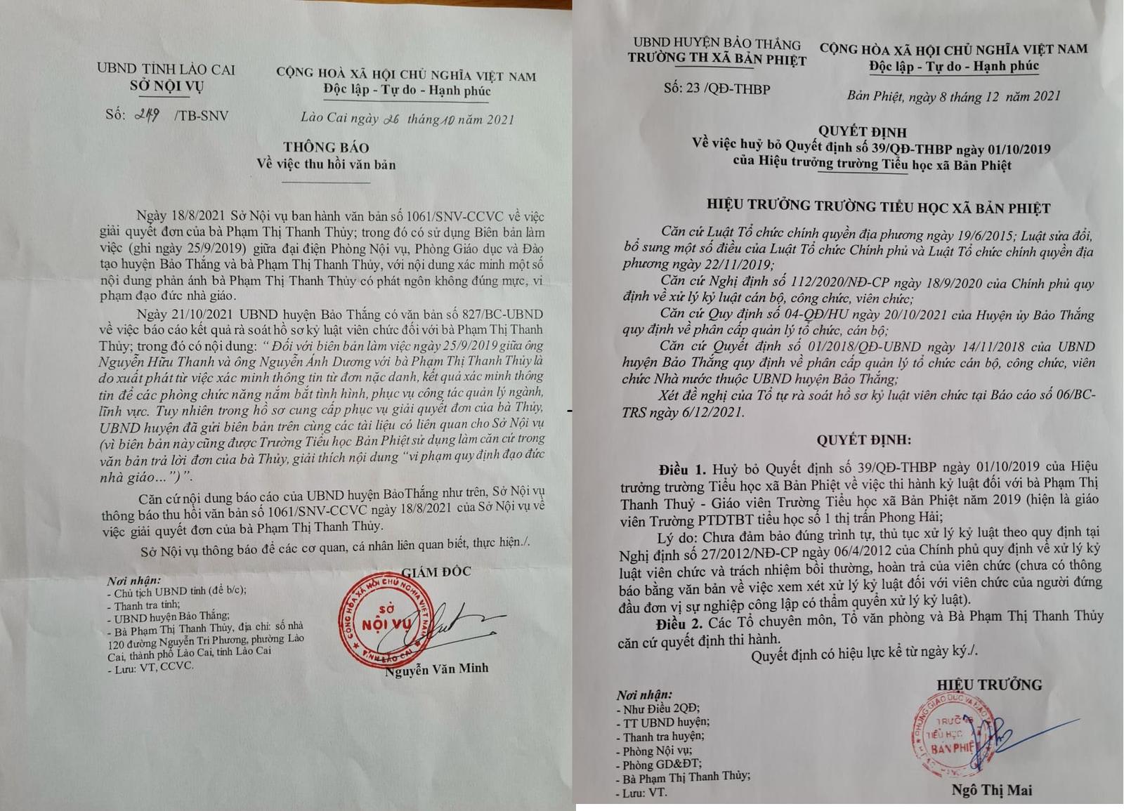 Sự việc này còn được UBND huyện Bảo Thắng khẳng định thêm lần nữa tại Quyết định số 554 ngày 23/2/2021: Quyết định số 8934 ngày 14/11/2019 đã được ban hành đúng trình tự, thủ tục, đã căn cứ vào các quy định của Nhà nước về thi đua khen thưởng, căn cứ Kết luận thanh tra số 05 ngày 21/8/2019 của UBND huyện Bảo Thắng về thanh tra tại Trường Tiểu học Bản Phiệt và Quyết định số 39 ngày 1/10/2019 của Trường Tiểu học Bản Phiệt về việc thi hành kỷ luật đối với viên chức.