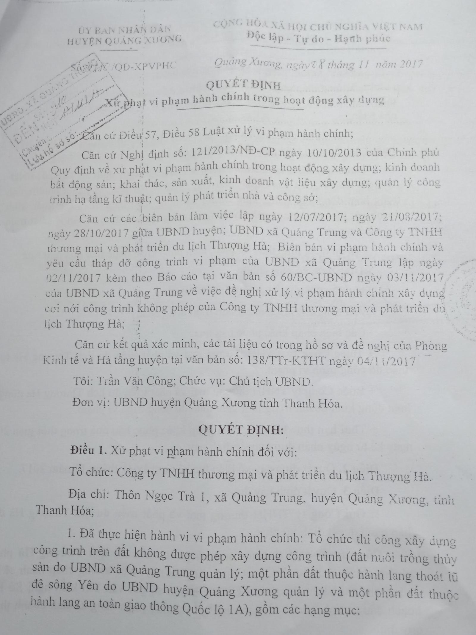 Quyết định xử phạt vi phạm hành chính của UBND huyện Quảng Xương đối với Công ty Thượng Hà về việc vi phạm xây dựng trái phép. Ảnh: Văn Thanh