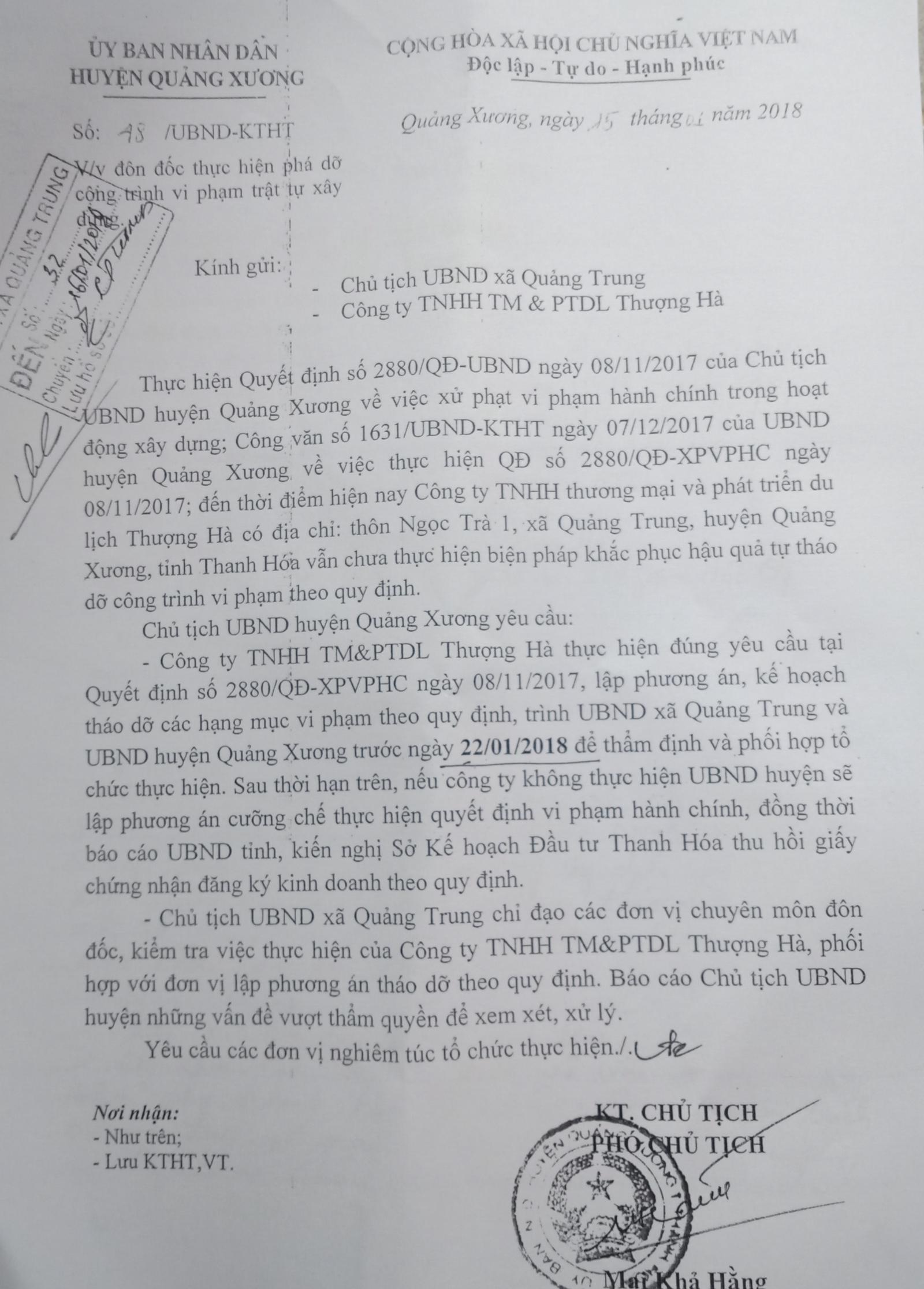 Ngày 4/12/2017, hết thời gian theo quy định, lãnh đạo UBND huyện Quảng Xương đã ký Văn bản 1631/UBND-KTHT tiếp tục đôn đốc Cty Thượng Hà phải thực hiện nghiêm Quyết định số 2880/QĐ-XPVPHC xử phạt vi phạm hành chính. Nội dung văn bản cho biết, đến thời điểm hiện nay, Cty Thượng Hà mới chỉ nộp tiền xử lý vi phạm hành chính. Chủ tịch UBND huyện yêu cầu Cty Thượng Hà phải lập phương án, kế hoạch tháo dỡ các hạng mục vi phạm theo đúng quy định, trình UBND xã Quảng Trung và UBND huyện Quảng Xương trước ngày 15/12/2017 để thẩm định và phối hợp tổ chức thực hiện tháo dỡ.