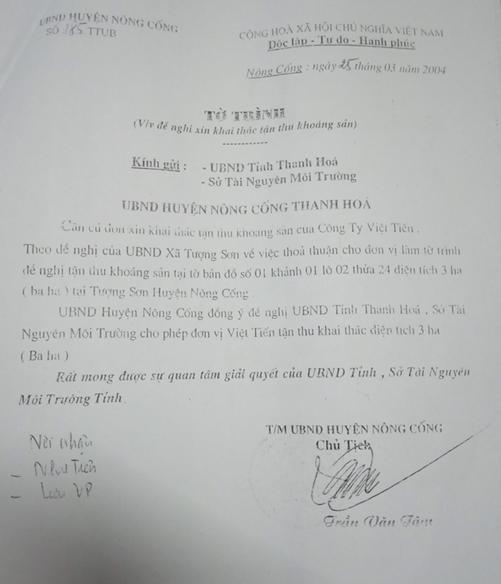 Trên cơ sở này, ngày 25/3/2004 UBND huyện Nông Cống có Tờ trình số 185/TTUB gửi UBND tỉnh Thanh Hóa và Sở Tài nguyên và Môi trường (TN&MT) với nội dung: “Căn cứ vào đơn xin khai thác tận thu khoáng sản của Cty Việt Tiến, theo đề nghị của UBND xã Tượng Sơn về việc thỏa thuận cho đơn vị làm tờ trình đề nghị tận thu khoáng sản tại tờ bản đồ số 01, đất lâm nghiệp, thửa số 24, diện tích 3 ha tại xã Tượng Sơn. UBND huyện Nông Cống đồng ý đề nghị UBND tỉnh Thanh Hóa và Sở TN&MT cho phép Cty Việt Tiến được tận thu khai thác diện tích 3 ha”. Tuy nhiên, đến nay vẫn chưa có sự đồng ý của UBND tỉnh về việc cho Cty Việt Tiến được tận thu khoáng sản ở địa điểm này.