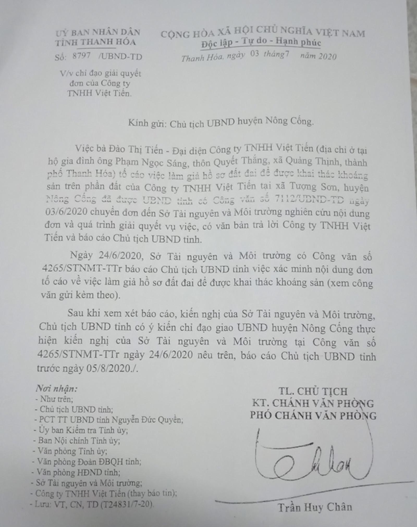 Liên quan đến vụ việc này, sau khi có báo cáo của Sở TN&MT, ngày 3/7/2020 UBND tỉnh Thanh Hóa đã có Văn bản số 8797/UBND-TD gửi Chủ tịch UBND huyện Nông Cống yêu cầu chỉ đạo Cơ quan Cảnh sát Điều tra tiếp tục làm việc Cty Việt Tiến, phục hồi việc giải quyết tố giác tội phạm hoặc kiến nghị khởi tố vụ án để tiếp tục xác minh theo quy định của pháp luật. Tuy nhiên, đến nay cơ quan công an vẫn chưa làm rõ “âm mưu”, “chủ đích”, ai đứng sau vụ việc hủy sổ đỏ cũ, cấp sổ đỏ mới để Cty Huy Hoàng được cấp mỏ.