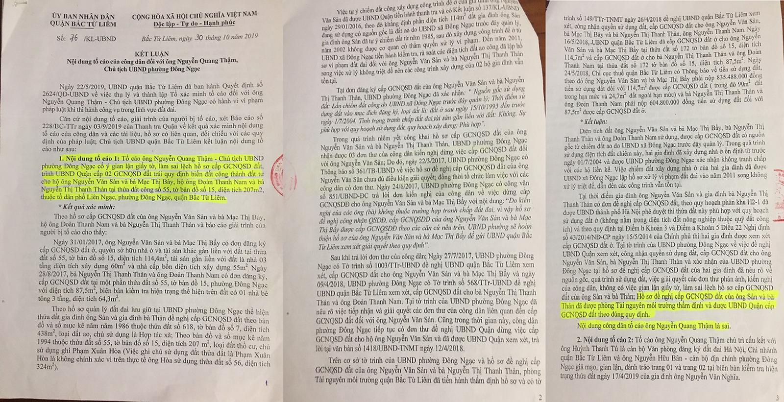 Đến Kết luận số 76/KL-UBND ngày 30/10/2019, khi kết luận nội dung công dân tố cáo ông Nguyễn Quang Thậm - Chủ tịch UBND phường Đông Ngạc cố ý gian lận giấy tờ, làm sai lệch hồ sơ cấp GCNQSDĐ, trình UBND quận cấp 02 GCNQSDĐ trái quy định biến đất công thành đất tư cho hộ gia đình ông Nguyễn Văn Sản và bà Mạc Thị Bẩy; hộ ông Đoàn Thanh Nam và bà Nguyễn Thị Thanh Thản tại thửa đất công số 55, tờ bản đồ số 15, diện tích 207m2, thuộc tổ dân phố Liên Ngạc, phường Đông Ngạc, quận Bắc Từ Liêm, ông Trần Thế Cương nhận định và kết luận: Tại tờ trình của UBND phường Đông Ngạc về việc đề nghị UBND quận xem xét, công nhận QSDĐ, cấp GCNQSDĐ cho ông Nguyễn Văn Sản và bà Nguyễn Thị Thanh Thản và xác nhận của UBND phường Đông Ngạc tại hồ sơ đề nghị cấp GCNQSDĐ của 2 gia đình đã nêu rõ về nguồn gốc, quá trình SDĐ, việc giải quyết các đơn thư phản ánh, kiến nghị của công dân (không hề nêu vấn đề tố cáo - PV), không có việc gian lận giấy tờ, làm sai lệch hồ sơ đề nghị cấp GCNQSDĐ của ông Sản và bà Thản; hồ sơ đề nghị cấp GCNQSDĐ của ông Sản và bà Thản đã được Phòng TN&MT thẩm định và được UBND quận cấp GCNQSDĐ theo quy định. Nội dung công dân tố cáo ông Nguyễn Quang Thậm là sai.