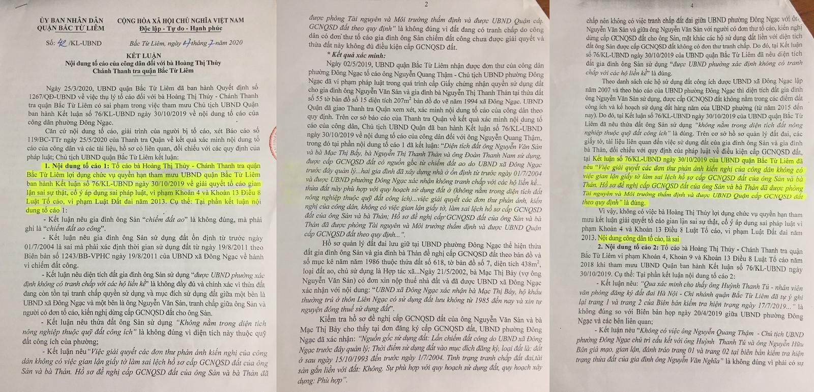 Tại Kết luận số 42/KL-UBND ngày 07/7/2020, công dân tố cáo bà Hoàng Thị Thủy - Chánh Thanh tra quận Bắc Từ Liêm lợi dụng chức vụ quyền hạn tham mưu UBND quận Bắc Từ Liêm ban hành Kết luận số 76/KL-UBND ngày 30/10/2019 về giải quyết tố cáo gian lận sai sự thật, cố ý áp dụng sai pháp luật, vi phạm khoản 4 và khoản 13 Điều 8 Luật Tố cáo, vi phạm Luật Đất đai năm 2013. Cụ thể, theo người tố cáo, Kết luận 76 nêu gia đình ông Sản “chiếm đất ao” là không đúng mà phải ghi là “chiếm đất ao công”. Kết luận gia đình ông Sản sử dụng ổn định từ trước ngày 01/7/2004 là sai mà phải là xác định thời gian SDĐ từ 19/8/2011 theo Biên bản số 1243/BB-VPHC ngày 19/8/2011 của UBND xã Đông Ngạc về hành vi chiếm đất công. Kết luận nêu diện tích gia đình ông Sản sử dụng “được UBND phường xác định không tranh chấp với các hộ liền kề” là không đầy đủ và chính xác vì thửa đất đang còn tồn tại tranh chấp QSD và mục đích SDĐ giữa một bên là UBND xã Đông Ngạc và một bên là ông Nguyễn Văn Sản, tranh chấp giữa ông Sản và người có đơn tố cáo, kiến nghị dừng cấp GCNQSDĐ cho ông Sản.