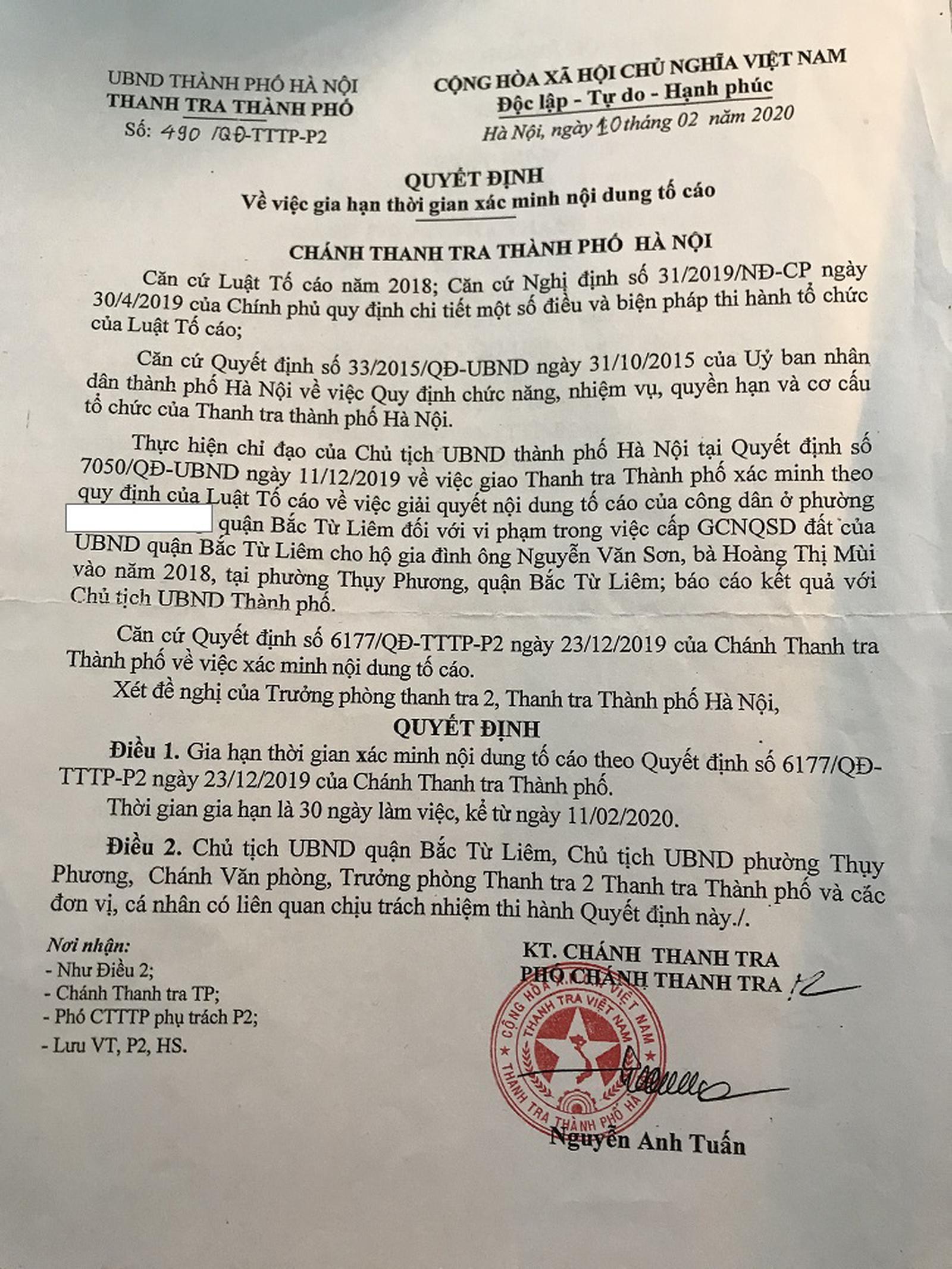 Quyết định 490 ngày 10/2/2020 của Chánh Thanh tra Hà Nội gia hạn kéo dài thêm 30 ngày làm việc kể từ ngày 11/2/2020 để xác minh nhưng đến nay cũng chưa có kết luận giải quyết
