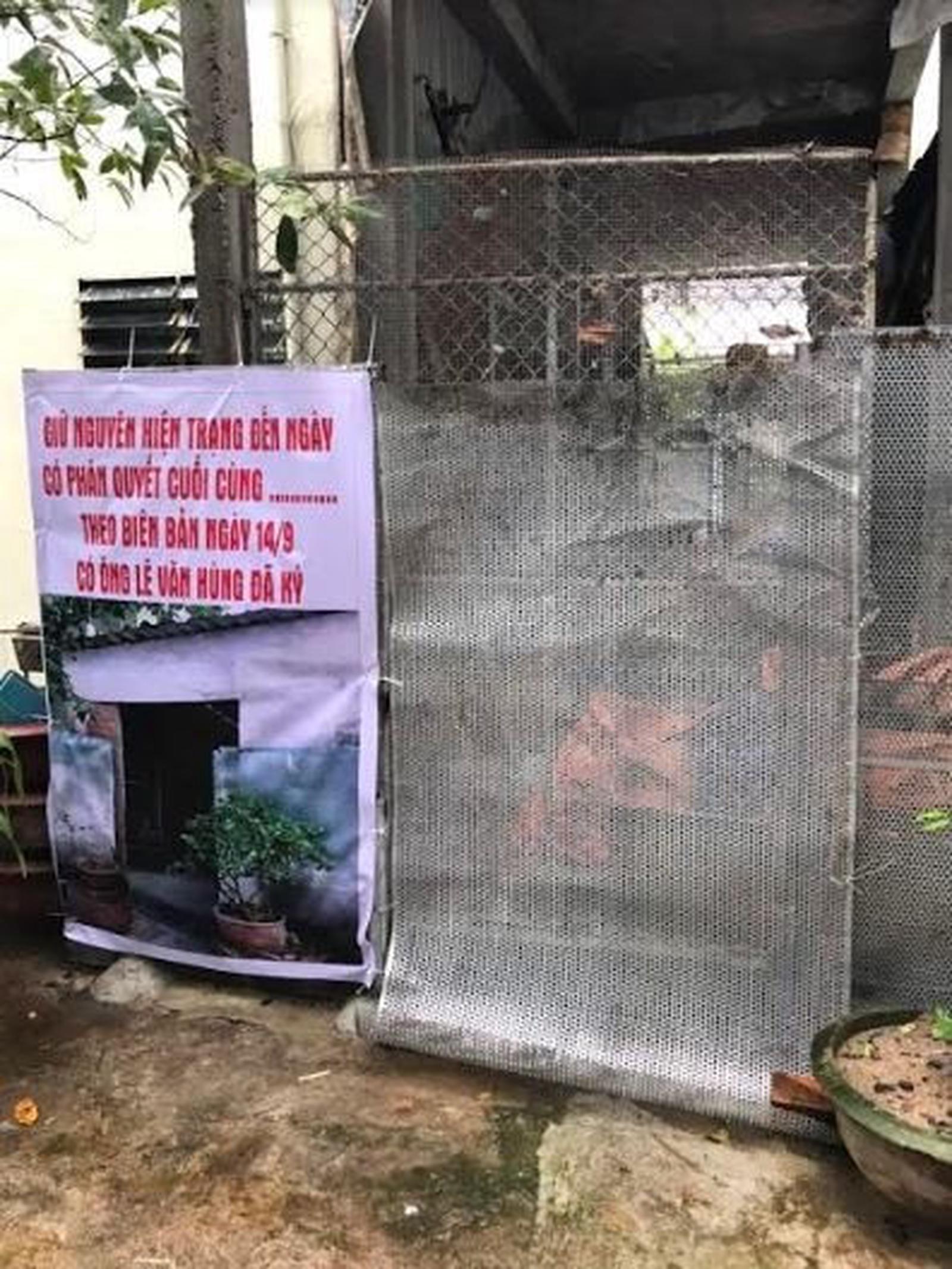 Ông Hiểu căng băng rôn “Giữ nguyên hiện trạng đến ngày có phán quyết cuối cùng…”, nhằm ngăn cản quyết liệt việc xây nhà của ông Hùng. Ảnh: NP