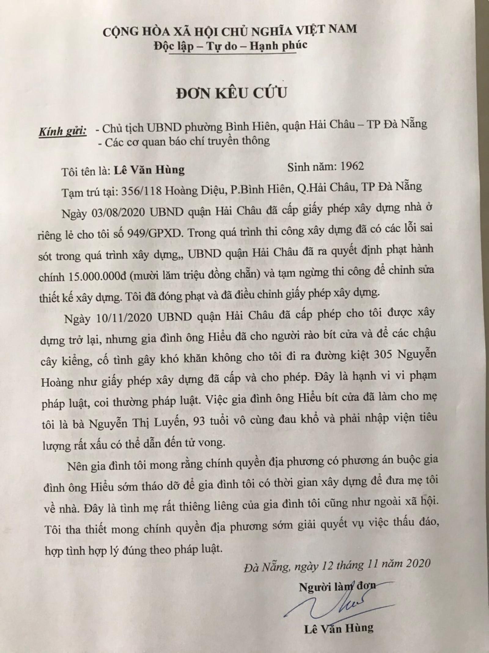 Tuy nhiên, việc xây dựng nhà quá khó khăn, trắc trở do gia đình ông Hiểu rào bít cửa và để các chậu cây cảnh ngăn không cho ông Hùng ra kiệt 305 Nguyễn Hoàng như giấy phép xây dựng đã cấp. Ngày 12/11, ông Hùng có đơn kêu cứu đến UBND phường Bình Hiên nhờ can thiệp.