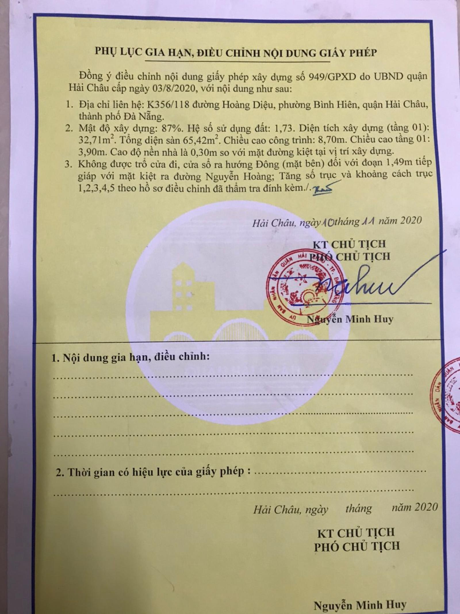 Giấy phép điều chỉnh xây dựng của UBND quận Hải Châu cấp cho ông Hùng ngày 10/11/2020. Ảnh: NP
