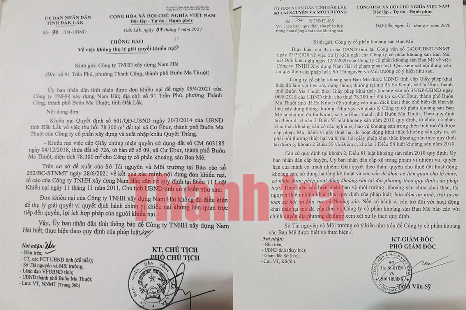 Tại Văn bản số 866/STNMT-TTr ngày 8/4/2021 về việc xử lý đơn kiến nghị của Công ty Ban Mê, Sở TN&MT khẳng định: “Qua kiểm tra thực địa tại khu vực mỏ đá của Công ty Cổ phần Khoáng sản Ban Mê thì không có sự chồng lấn về diện tích, ranh giới đối với khu vực mỏ đá đã được UBND tỉnh cấp phép cho Công ty TNHH Xây dựng Nam Hải”.