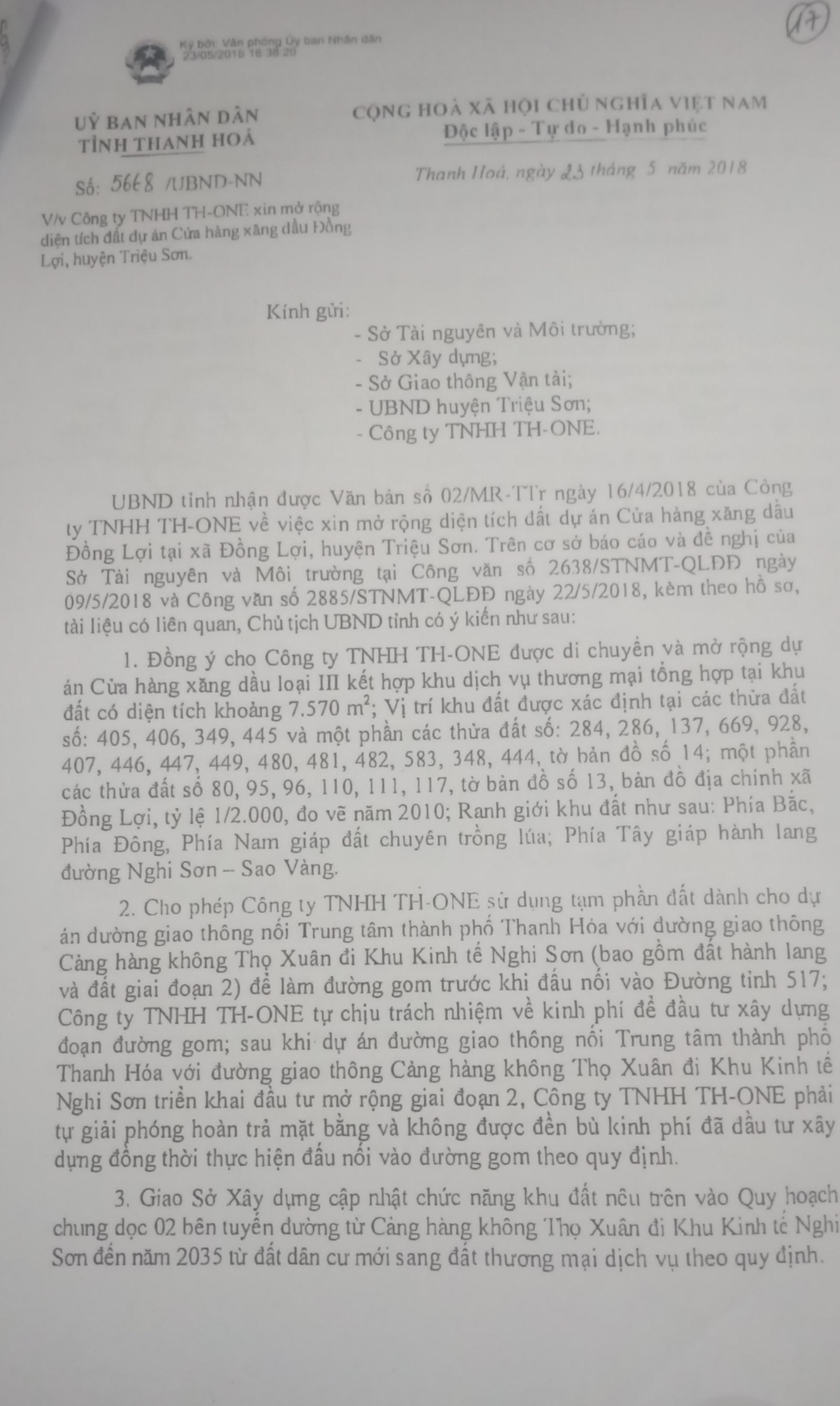 Sau khi giao các sở, ban, ngành tham mưu, ngày 23/5/2018, Chủ tịch UBND tỉnh Thanh Hóa có Công văn số 5668/UBND-NN đồng ý cho Công ty TNHH TH-ONE được di chuyển và mở rộng dự án cửa hàng xăng dầu loại III, kết hợp khu dịch vụ thương mại tổng hợp tại khu đất có diện tích khoảng 7.570m2, vị trí khu đất được xác định tại các thửa đất số 405, 406, 349, 445 và một phần các thửa đất số 284, 286, 137, 669, 928, 407, 446, 447, 449, 480, 481, 482, 583, 348, 444 thuộc tờ bản đồ số 14 và một phần các thửa đất số 80, 95, 96, 110, 111, 117 thuộc tờ bản đồ số 13, bản đồ địa chính xã Đồng Lợi, huyện Triệu Sơn, tỷ lệ 1/2000 đo vẽ năm 2010.