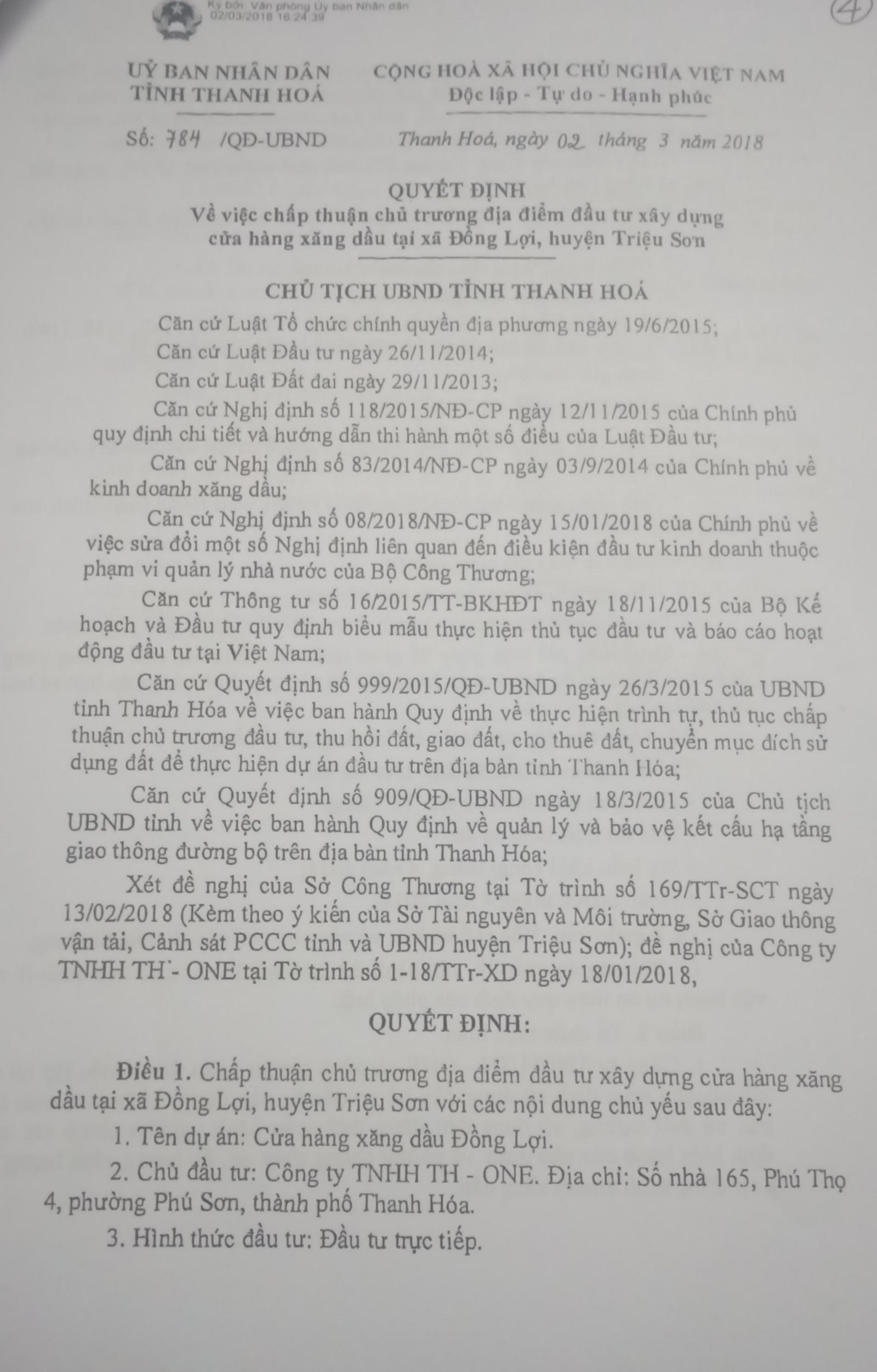 Tìm hiểu của phóng viên được biết, dự án cửa hàng xăng dầu tại xã Đồng Lợi, huyện Triệu Sơn của Công ty TNHH TH-ONE được Chủ tịch UBND tỉnh Thanh Hóa chấp thuận Chủ trương đầu tư số 784/QĐ-UBND ngày 03/2/2018.
