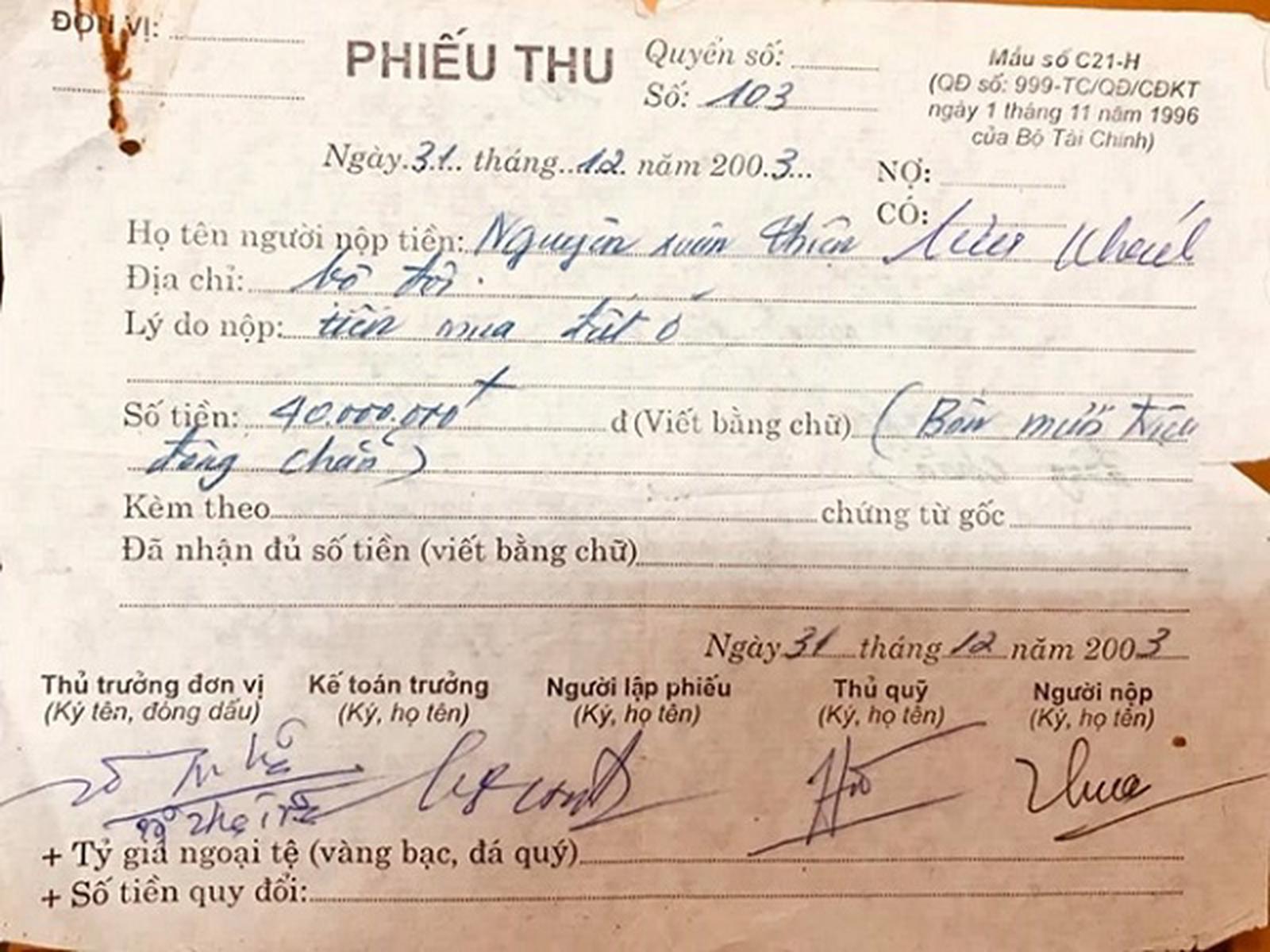 Phiếu thu số 103 ngày 31/12/2003 của UBND xã Thạch Hưng. Ảnh: TQ